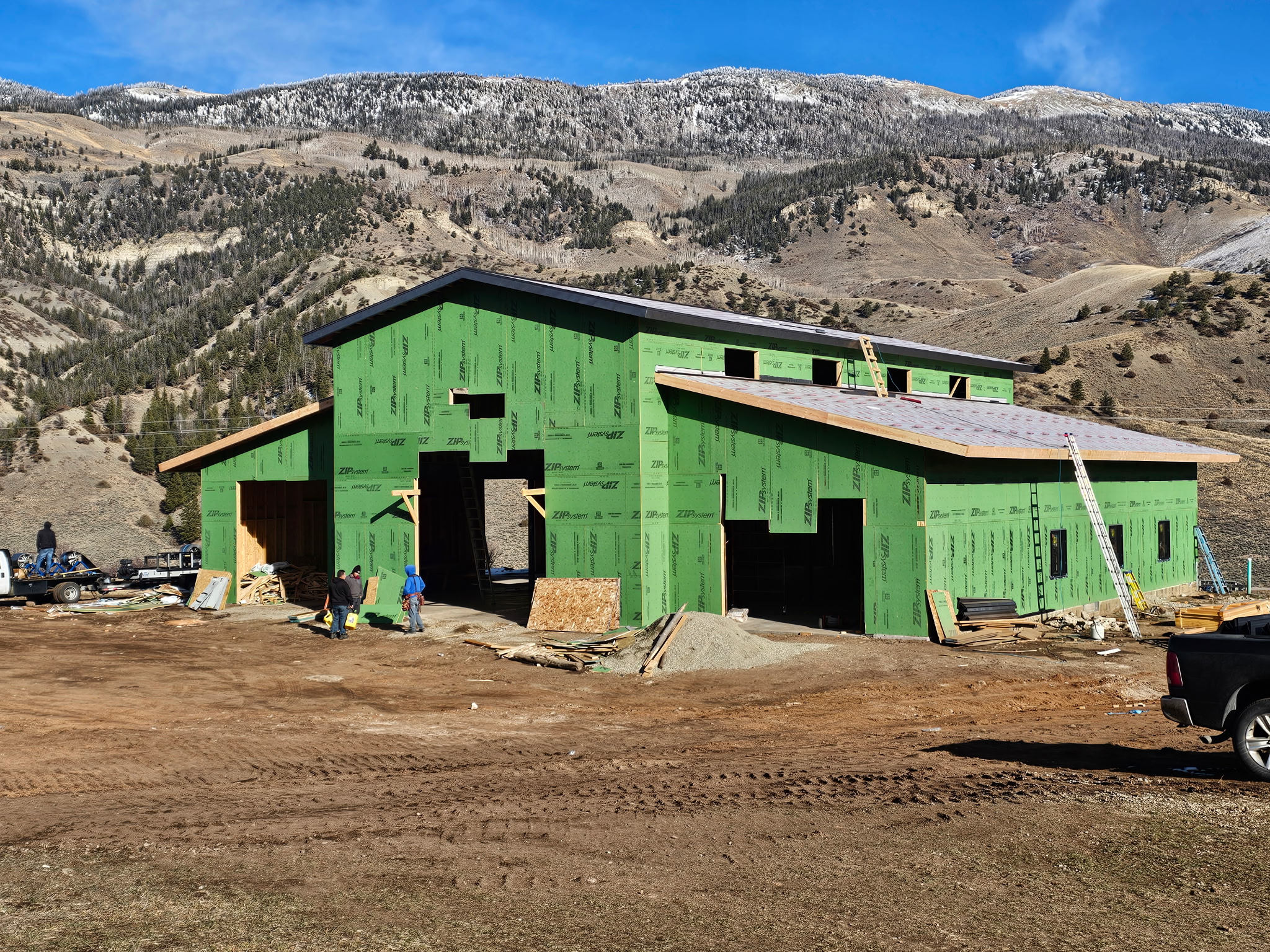 typical barn exterior large front concrete pad in front of black garage doors green metal roof add forest type landscape around building