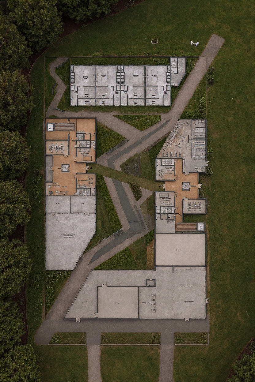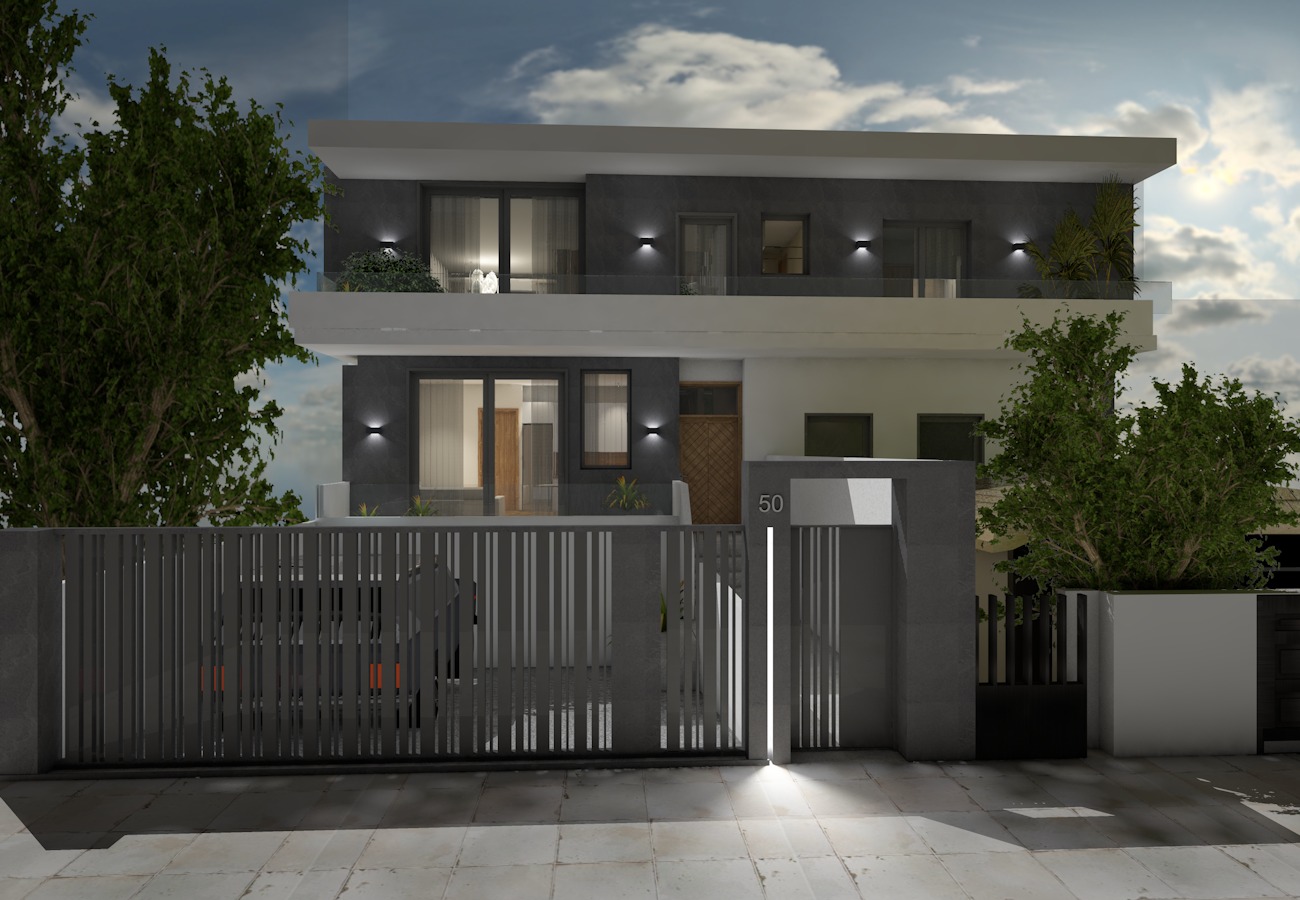 realistic exterior shot sconces on the wall lightning on the left there is roof lights