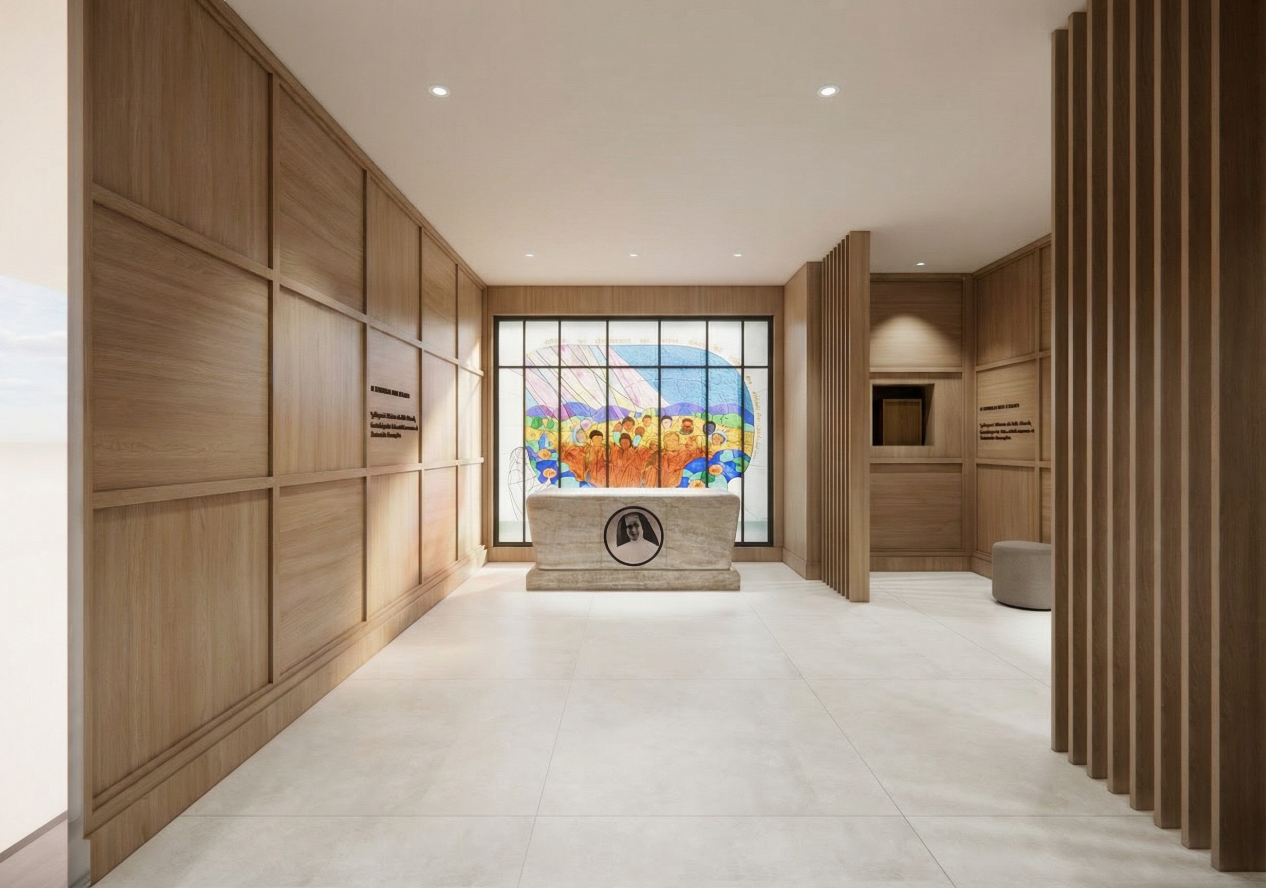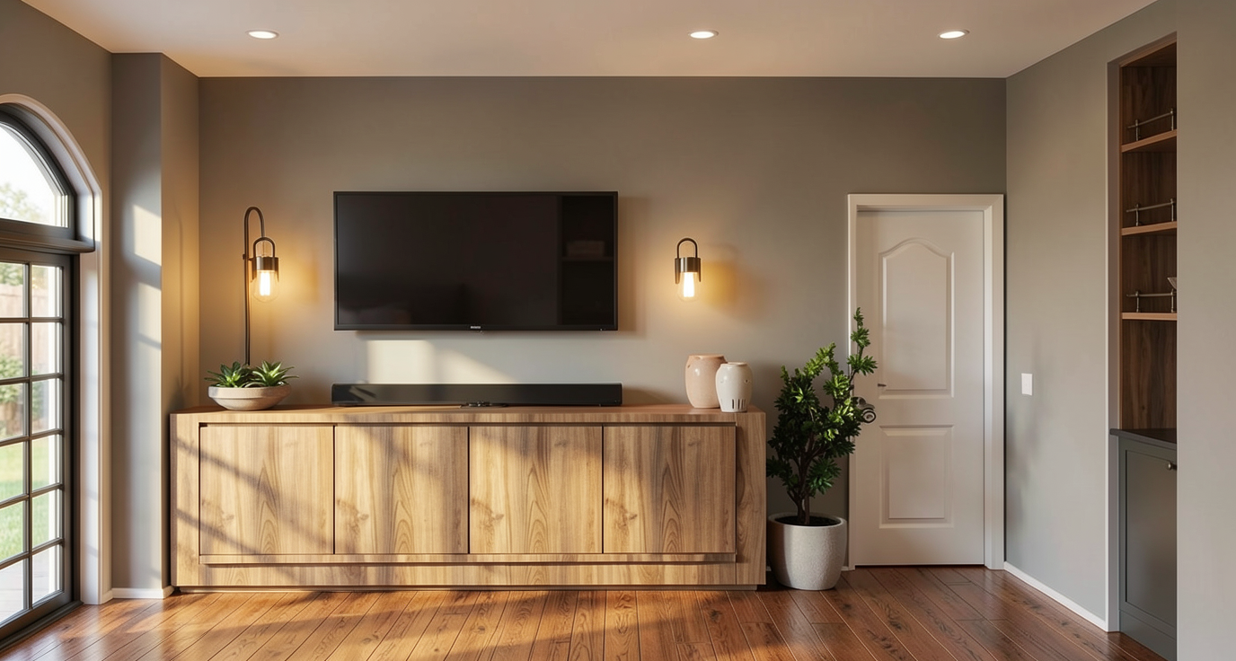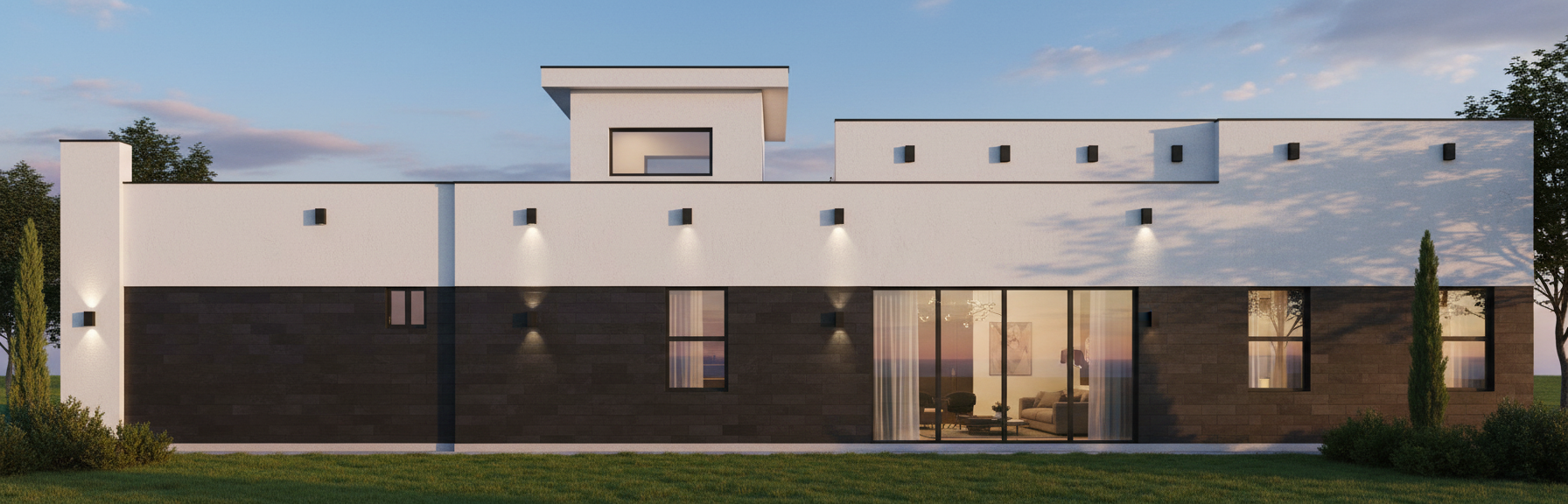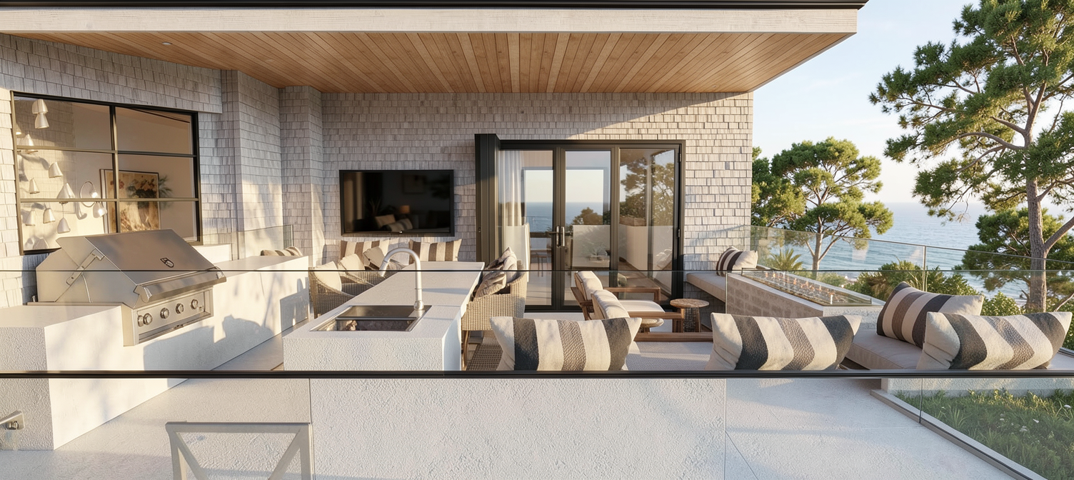 create a photorealistic rendering of this second story outdoor bbq patio area keep all architectural details landscaping lighting and finishes exactly the same except make the left walls with window connect as one wall to bump out wall by tv and on that wall surrounding the left window change siding to white board and batton material also add visual comfort light cupertino medium wall lantern in black exterior wall sconce to wall right of bifold doors