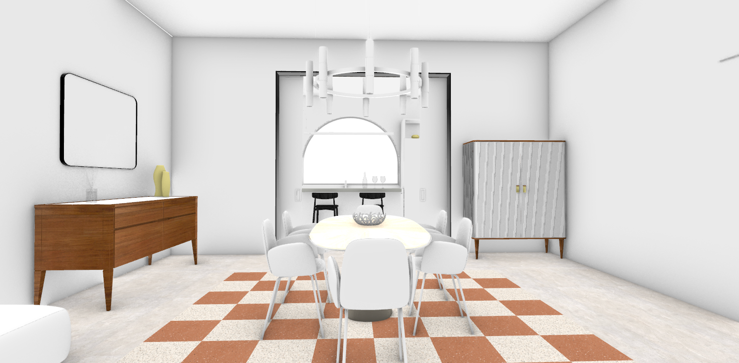 conserva pavimento a scacchi porta ingresso a destra con vetro e maniglia anticata tavolo con piano in marmo calacatta sedie con struttura metallo scuro e rivestimento tessuto beige credenza legno noce con ante vetro cannettato cucina colore bianco venato penisola bianca con piano color tortora sgabelli legno nero finestra ad arco legno bianco con vetro porte vetrate cucina in vetro semitrasparente e struttura metallo scuro divano pelle beige atmosfera rilassante luce naturale del mattino
