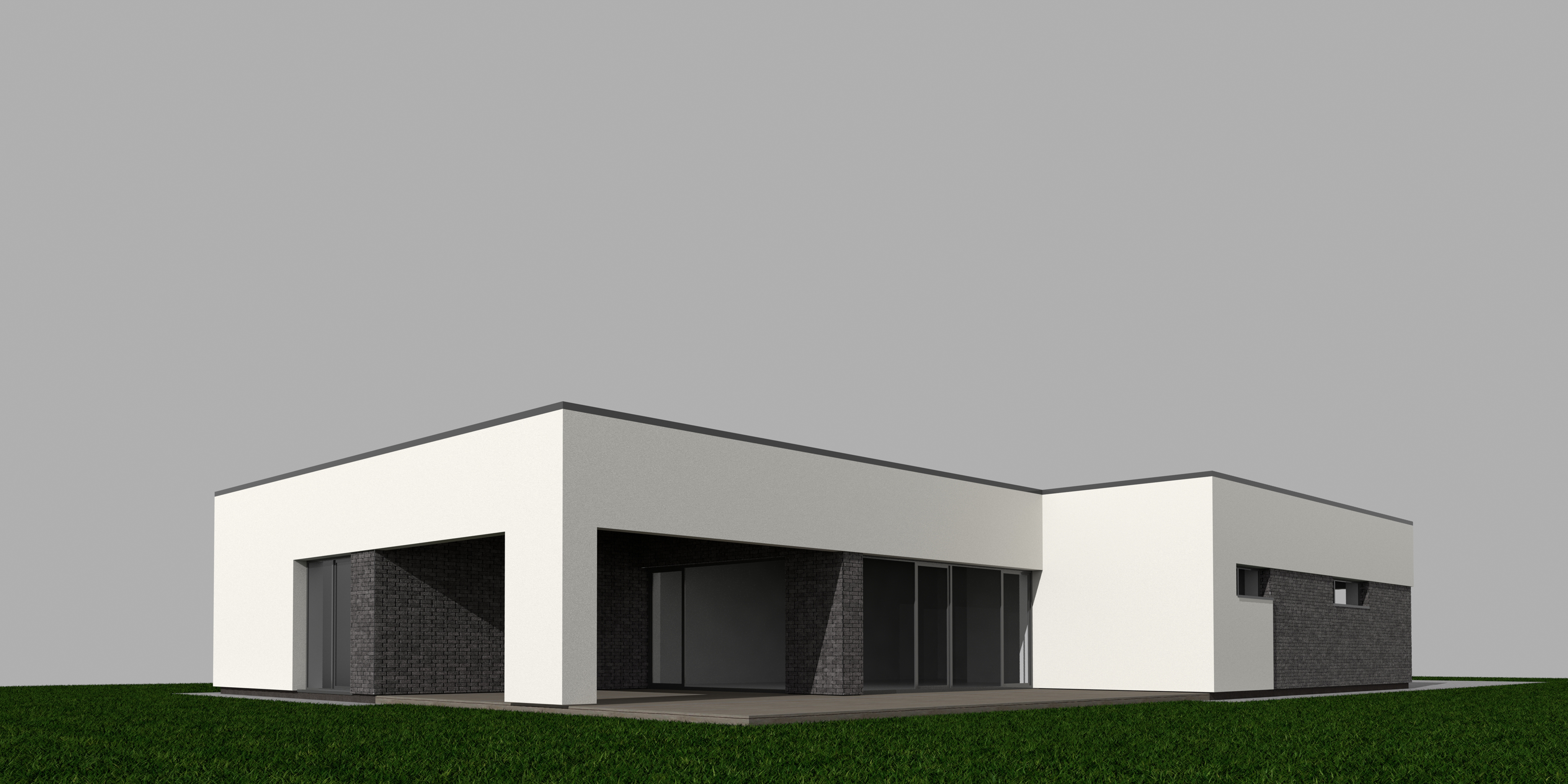 a modern minimalist single story house with a flat roof featuring a sleek white plaster facade and dark gray clinker the driveway is paved with light gray paving leading to a dark gray garage door the surrounding landscape includes lush green grass the atmosphere is serene and contemporary set on a mild summer noon with soft natural lighting enhancing the clean lines and contrasts of the architecture add some shrubs