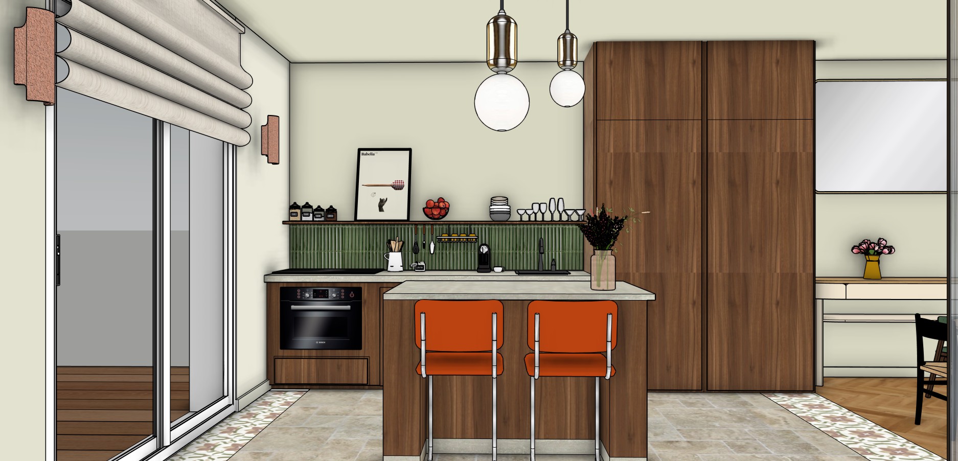 photo realist kitchen with the same terasse and garden as the previous renderings