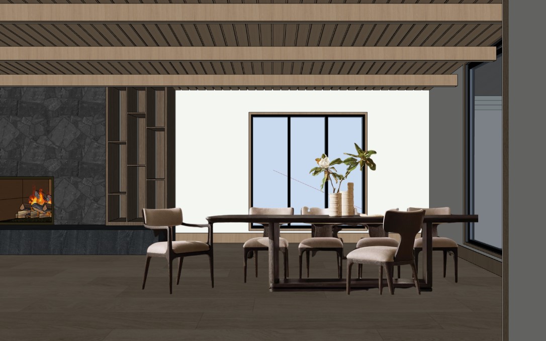 photorealistic enhancement of the provided architectural render preserve the exact architecture layout materials furniture placement and fixtures from the original image with no redesign or modifications the purpose is only to improve realism and lighting quality apply physically accurate global illumination and natural light behavior lighting should feel balanced and natural as in professional interior architectural photography soft indirect daylight fills the space with gentle light bounce from surrounding surfaces shadows are soft subtle and physically realistic with natural falloff all materials remain unchanged but respond to light more realistically stone surfaces with natural micro texture wood grain with depth matte plaster walls with soft diffusion and brushed metal fixtures with correct reflections no surfaces emit light unless they are actual light fixtures plumbing fixtures such as shower heads and faucets must remain non emissive and only reflect ambient light render as high end interior photography using a full frame camera with a 24 35mm architectural lens balanced exposure realistic dynamic range subtle depth of field and natural color grading the image should look like a professionally photographed luxury interior rather than a computer render do not change architecture do not change materials no redesign no new objects no additional lights no glowing fixtures no light from shower heads or faucets no dramatic shadows no surreal lighting no warped geometry no stylization the windows looking out to the exterior should be displaying mountains in the distance some trees and later in the afternoon there should be led light strips inside each cubby on the left side running vertically the wood floor should remain the same as the original image there should be a chandelier above the table that looks like tree branches and it should be dimly lit