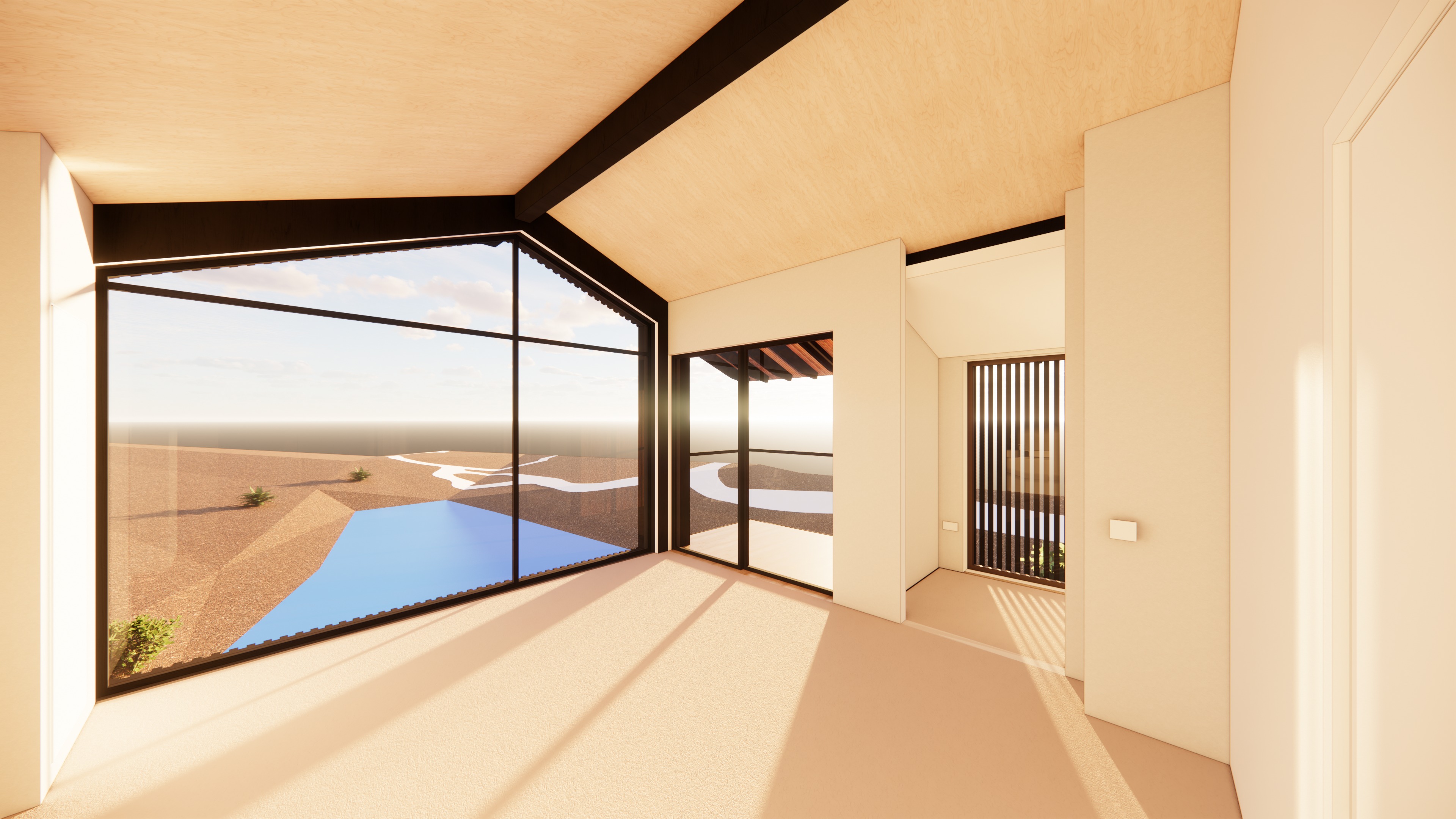 make realistic internal is modern warm colours and woodwn beams opening ar dark black outside you can see a pond and natural vegetations