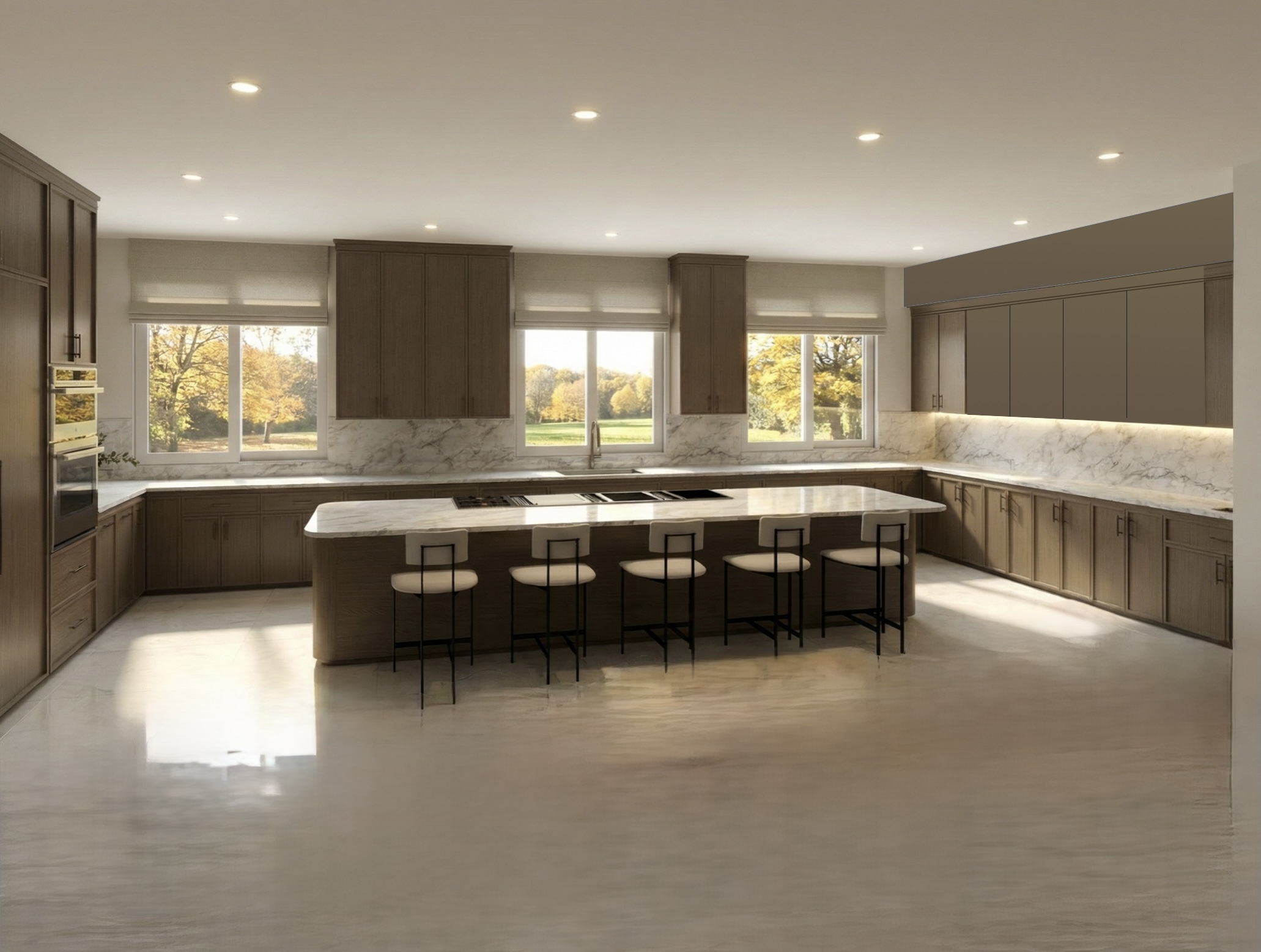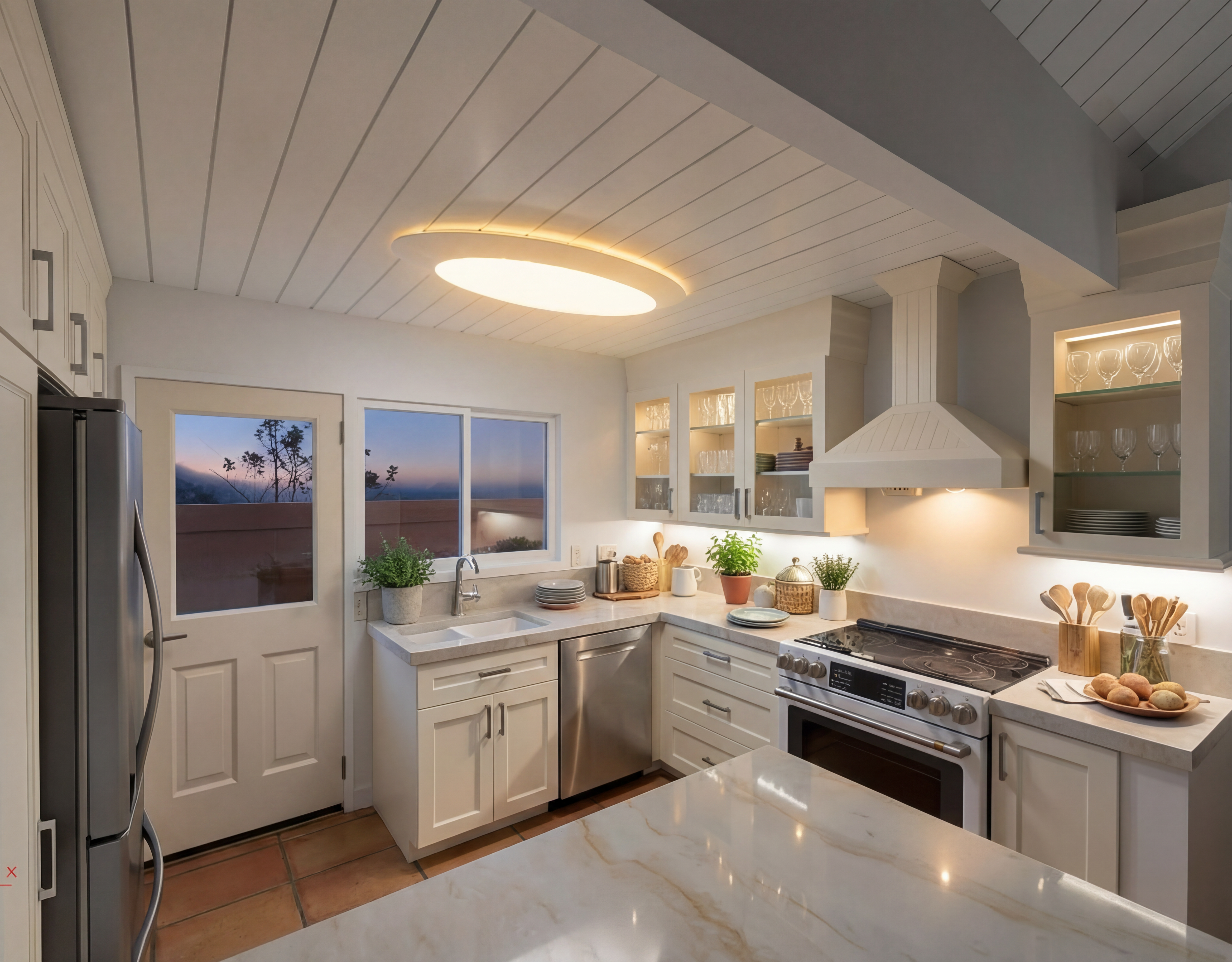 make upper cabinetry on the right side wall glass door faced with down lights