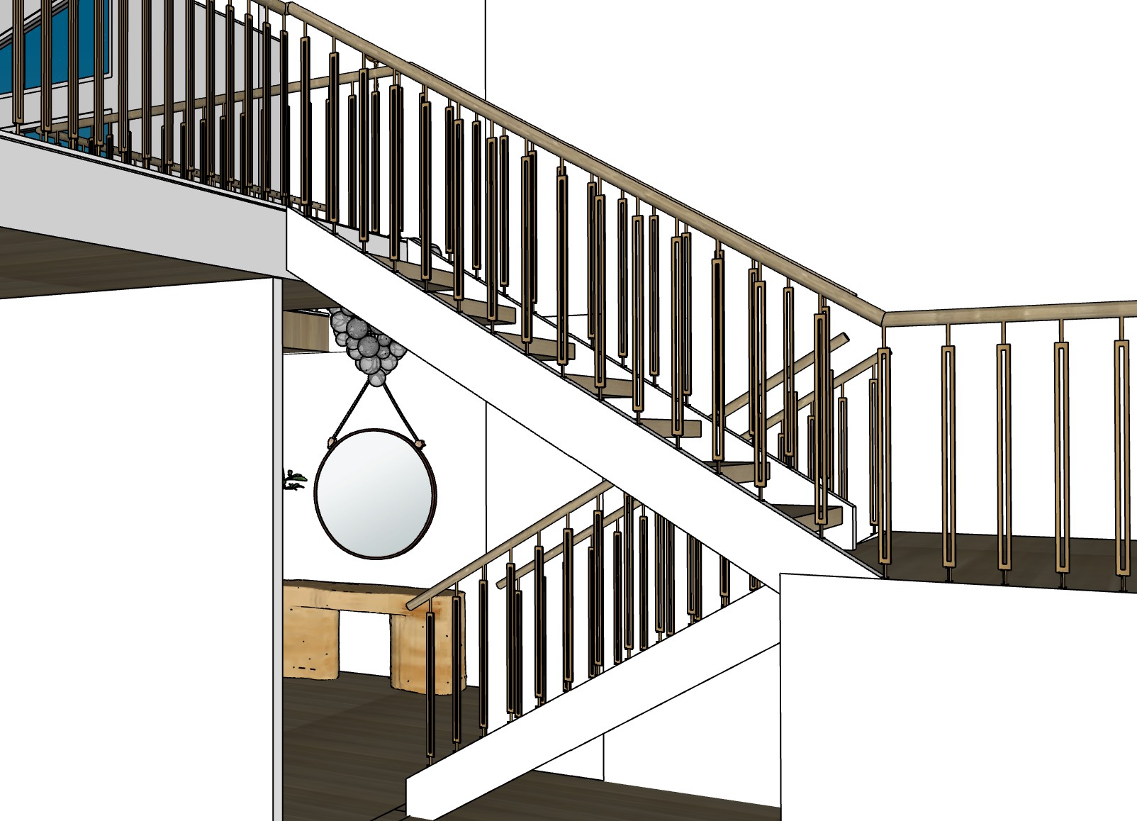 create photorealistic rendering of this stairway add 36 circular window with white trim clear glass at appx 15 centered in tall back wall going up stairs keep handrail light white oak floors light white oak and stair spindles champagne bronze metal posts keep spindle designs as is add eucalyptus trees and landscaping in windows keep white painted stair and floor stringer keep stairs light oak
