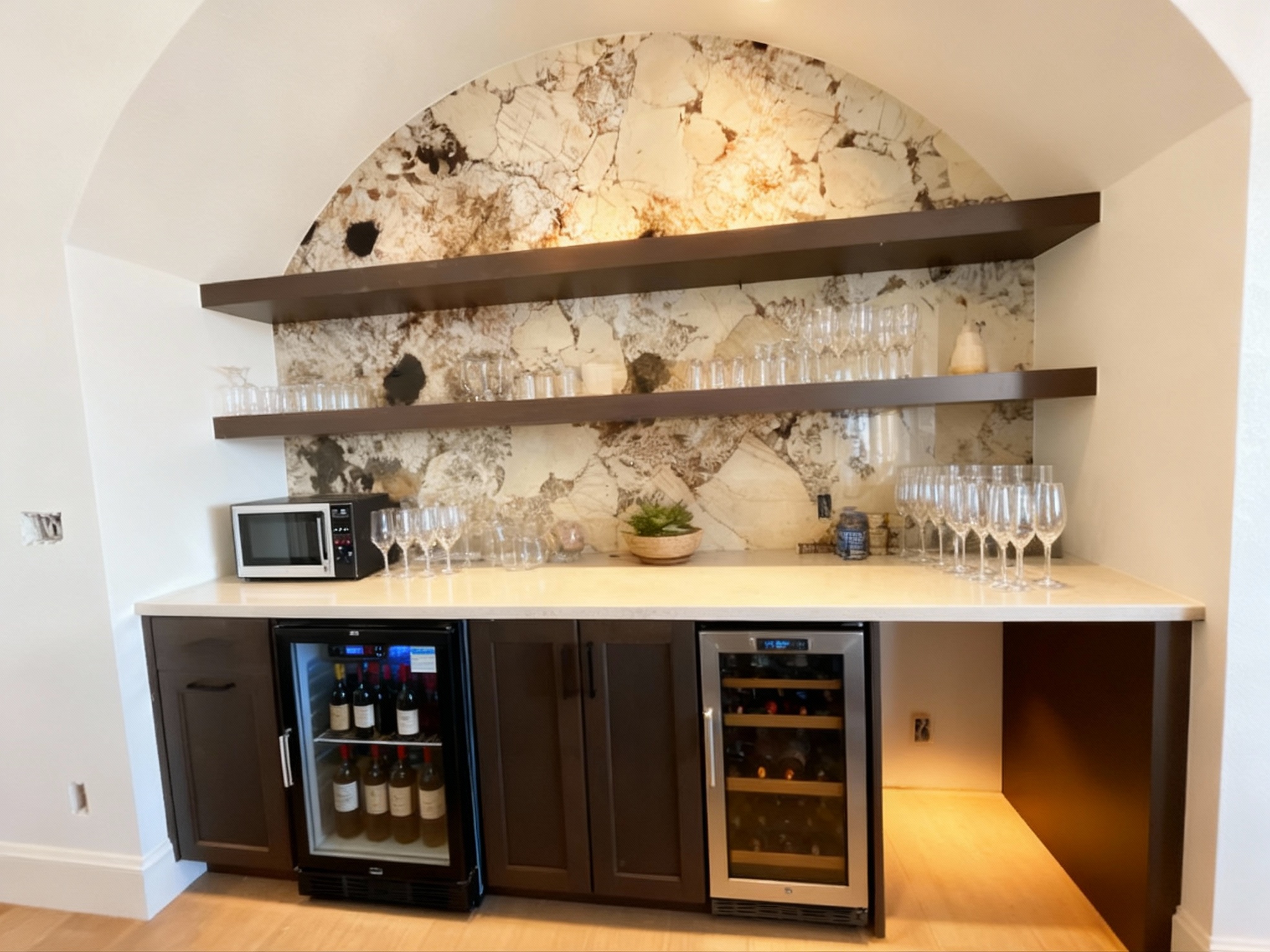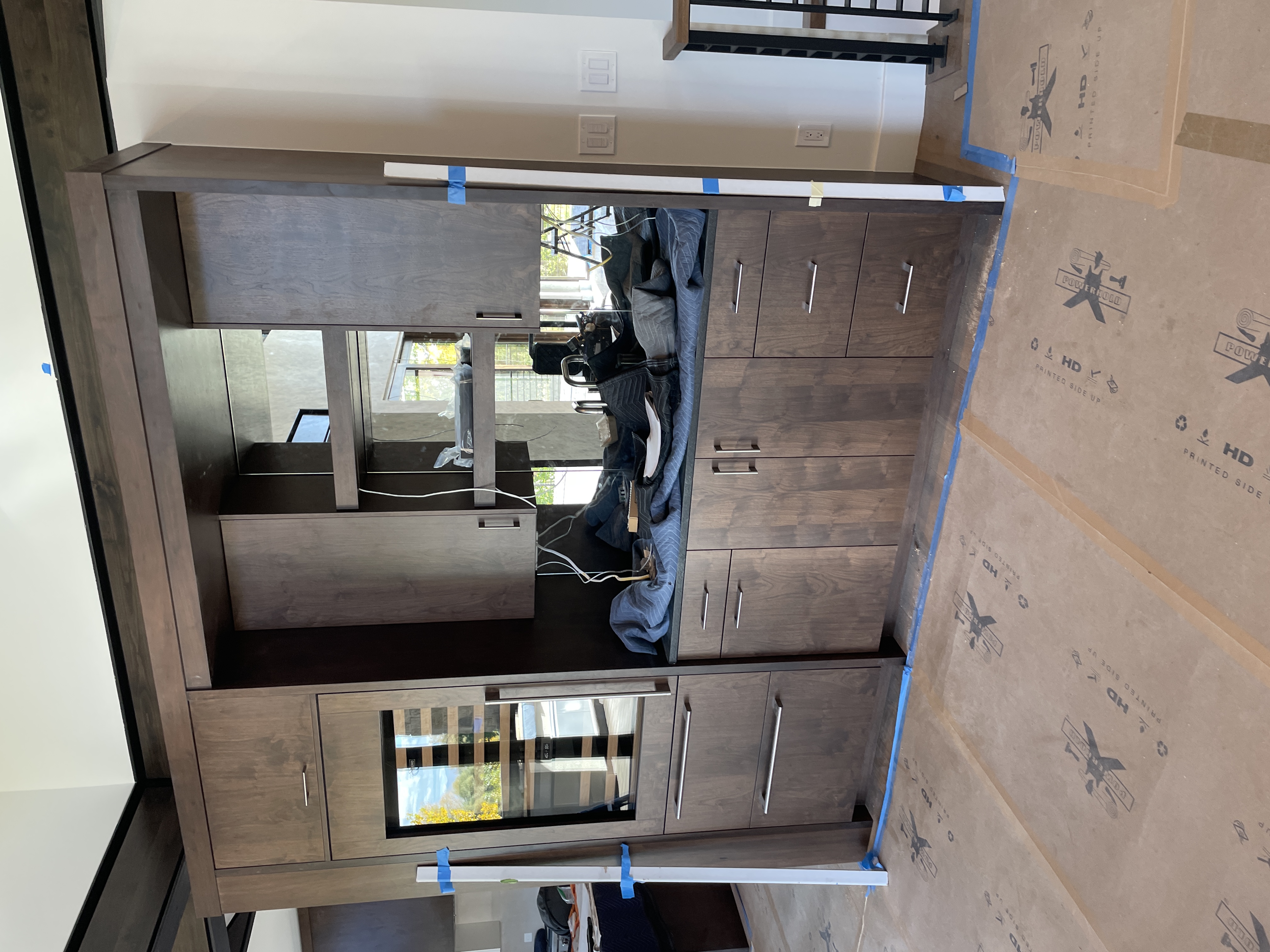 wood flooring remove the blue tape and the silver rods leaning up against the cabinets clean everything off of the countertop remove the cords stage the countertop for a bar