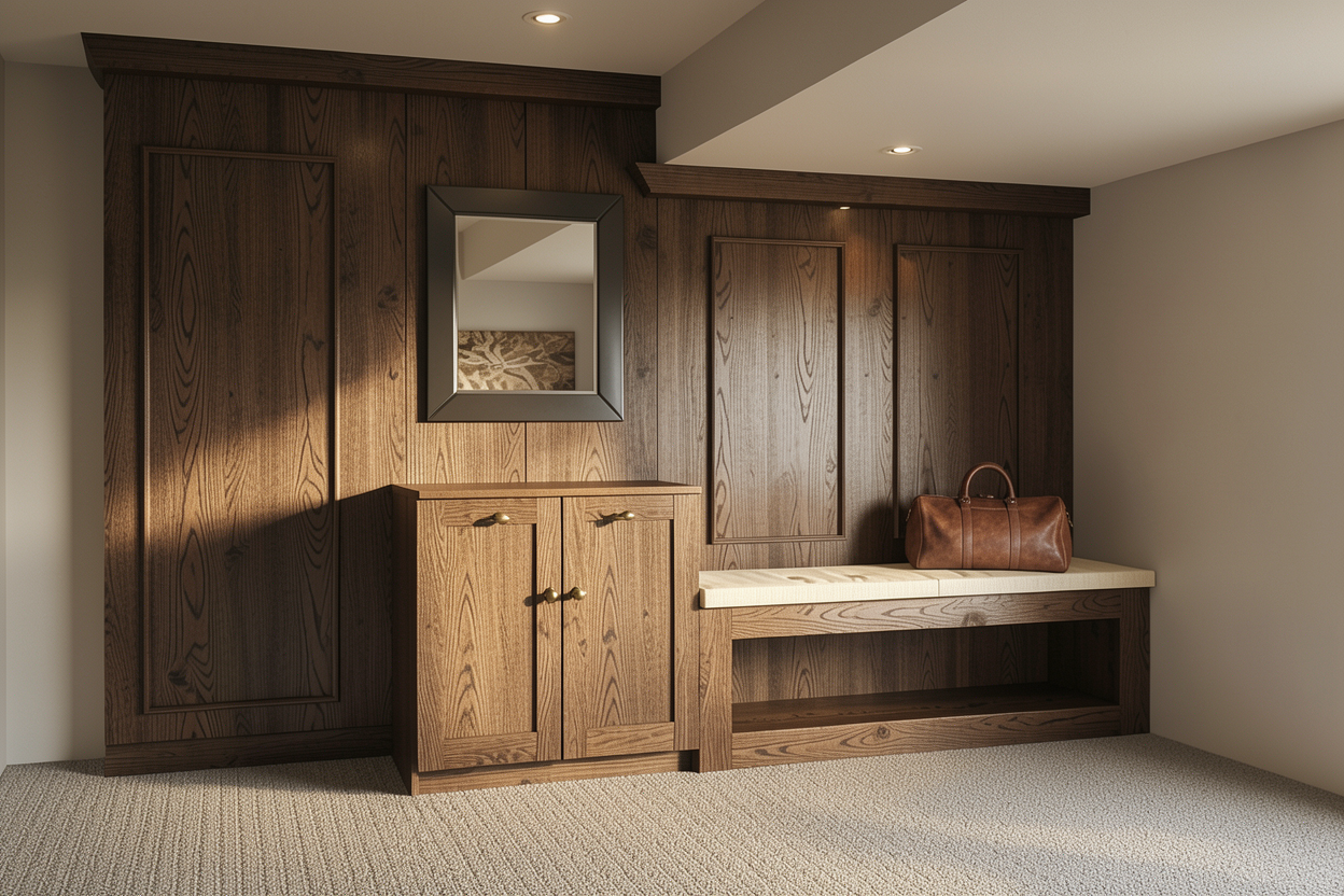 render this perspective view of the home with black vertical wood siding putty grey brick where shown warm wood eaves and a stone paver path leading up to the house