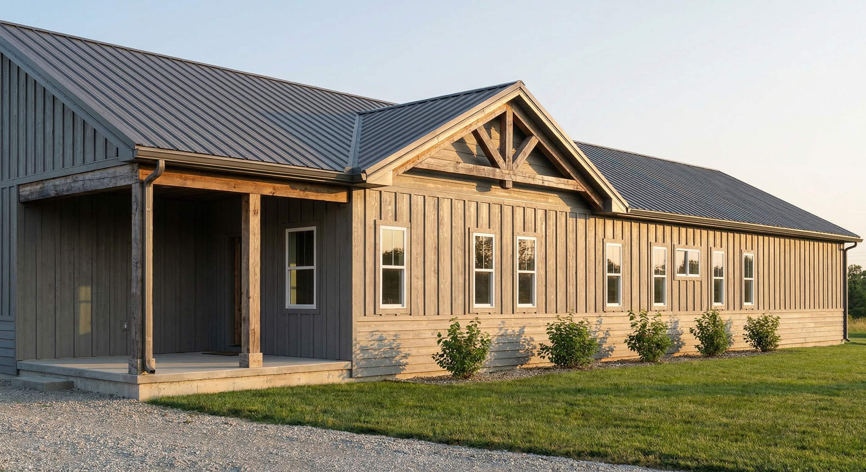 add stone dark beige siding and paneling add simple landscaping