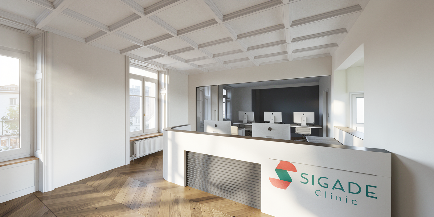 a realistic architectural interior render of a modern cardiology clinic waiting room and reception area the space is bright calm and inviting with soft natural sunlight entering from tall windows on the left side the sunlight casts warm soft shadows across a light herringbone wooden floor the design is minimal and clean with white walls elegant panel detailing and a coffered ceiling with recessed lighting a curved reception desk sits in the foreground with a glass partition separating a quiet back office area behind it outside the windows subtle reflections show an urban street with buildings across the road slightly blurred for realism the atmosphere should feel professional calm and trustworthy reflecting a high end cardiology clinic cgade materials should be highly realistic soft matte painted walls natural wood flooring slightly reflective glass and clean white surfaces lighting should be soft and diffused with a warm daylight tone morning or late afternoon add subtle details like soft reflections realistic light bounce and gentle ambient occlusion the space should feel quiet clean and welcoming with a premium healthcare aesthetic