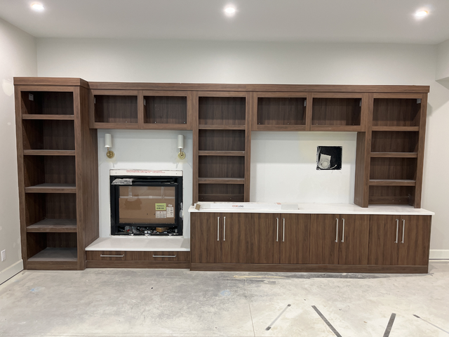 stage the shelves with books and accessories make the sconces lit above the fireplace finish the fireplace surround in the opening on the left and add a tv to the opening on the right and add carpet to the floor