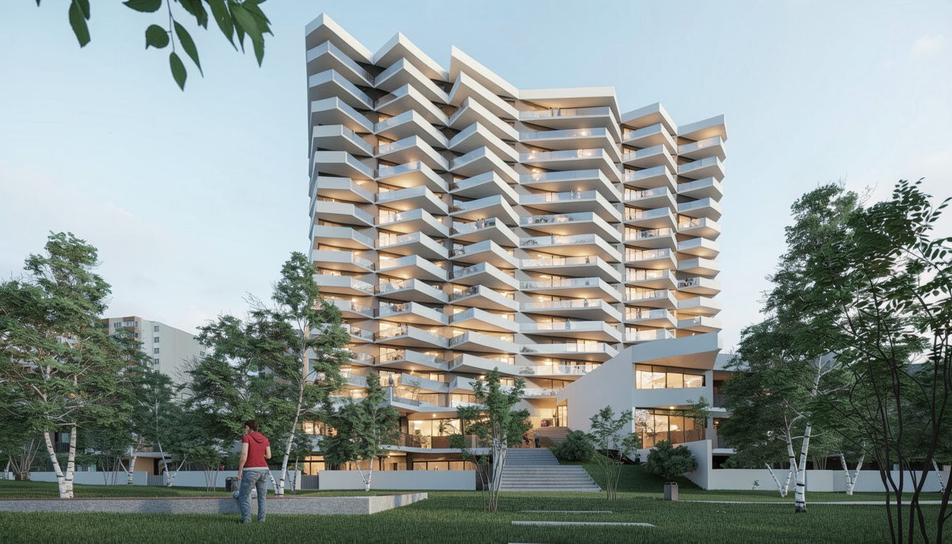 important preserve the existing geometry and the existing context exactly as provided preserve the existing windows do not add new windows do not modify alter reinterpret add remove scale or reshape any geometry do not change the site surroundings street layout neighboring buildings vegetation or context elements do not modify geometry scale proportions buildings road layout sidewalks or surrounding context in any way do not modify text soft night atmosphere diffused neutral light with subtle cold tones cinematic architectural mood warm interior lighting 4000k glowing from inside creating slight contrast between cool exterior and warmish interior large glass surfaces with realistic reflections soft mirror effect environmental reflections of sky and surroundingsimportant do not add new windows