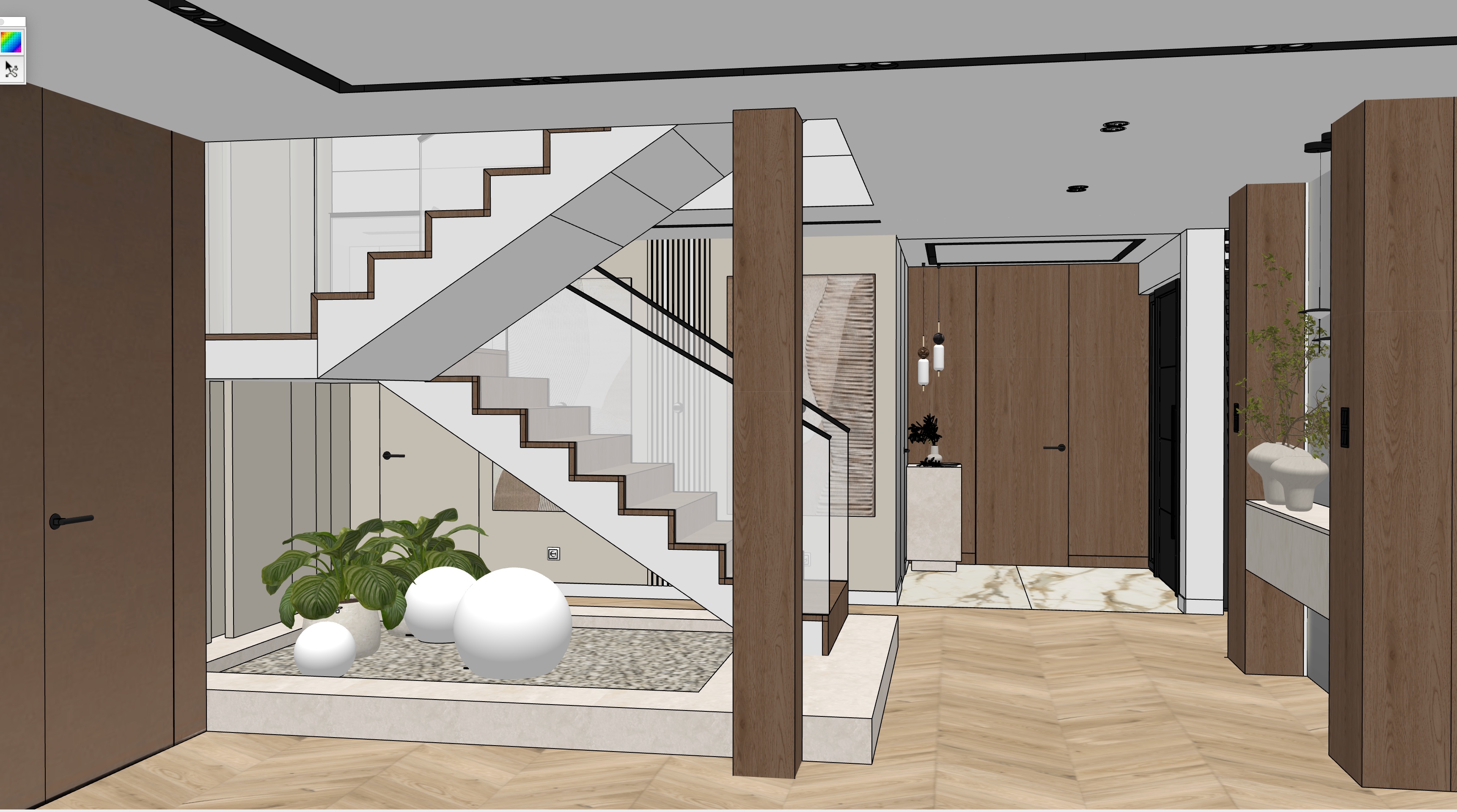 the bowls under the stair are shining doors on the left are cover in brown glass