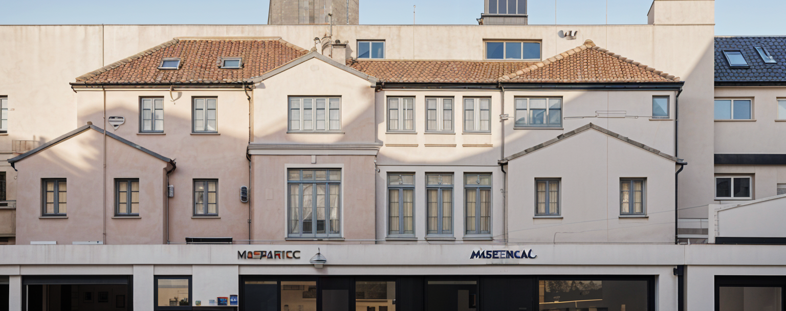create a rendering of a 1960 s ranch style home with white brick white front porch black shutters and a baby blue door porch with classical gable and cornice lanterns hung on the porch that are centered between the columns stairs on the right side of the porch driveway to the right side the house is on a steep hill with trees behind the home and grass in the front yard landscaping and native shrubs surrounding the front porch