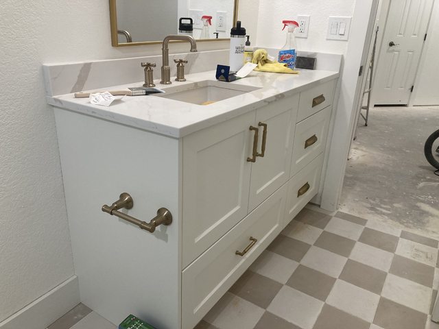 do not change the cabinets in any way preserve the exact cabinet colors materials finishes dimensions door and drawer styles hardware spacing alignment and all geometry exactly as shown do not alter the countertop shape backsplash appliances flooring lighting fixtures or wall structure only remove the construction materials clutter and mess from the scene clean the room and make it look finished and staged add a few simple tasteful home accessories appropriate for the style of the space but do not add or remove any furniture windows or architectural elements maintain the original lighting direction and realism enhance clarity and polish the photo while keeping the cabinetry and room design completely unchanged do not alter the lighting to keep the cabinet colors as they are in the image add flooring to the background and toilet paper on the rod