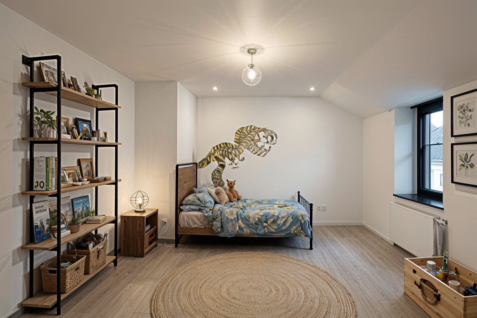 don t change the room and the position and colours of the walls and windows create a toddlers bedroom industrial style and natural colours