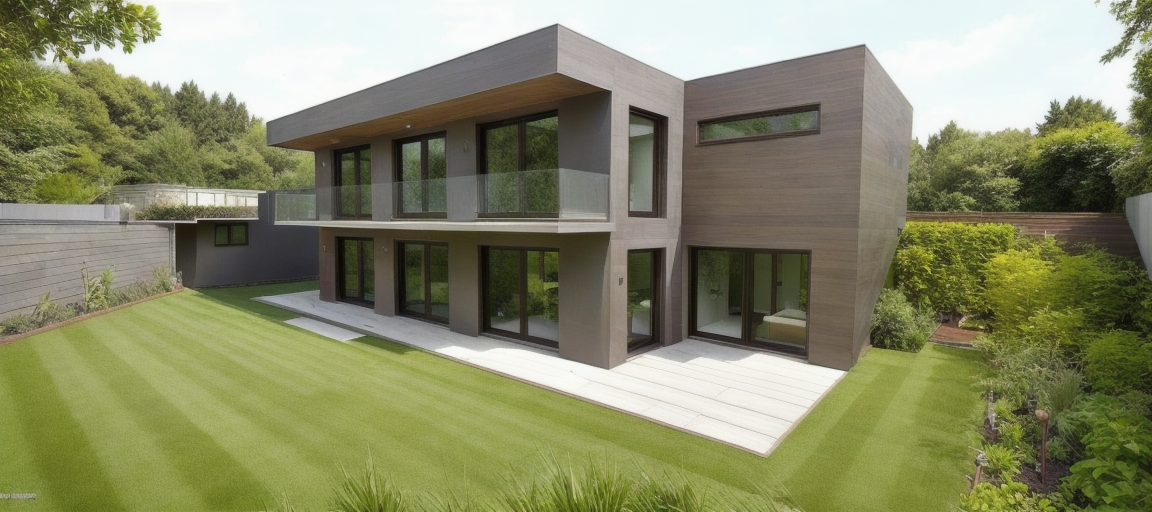a house with a fenced in porch and stairs surrounded by green grass and trees architecture