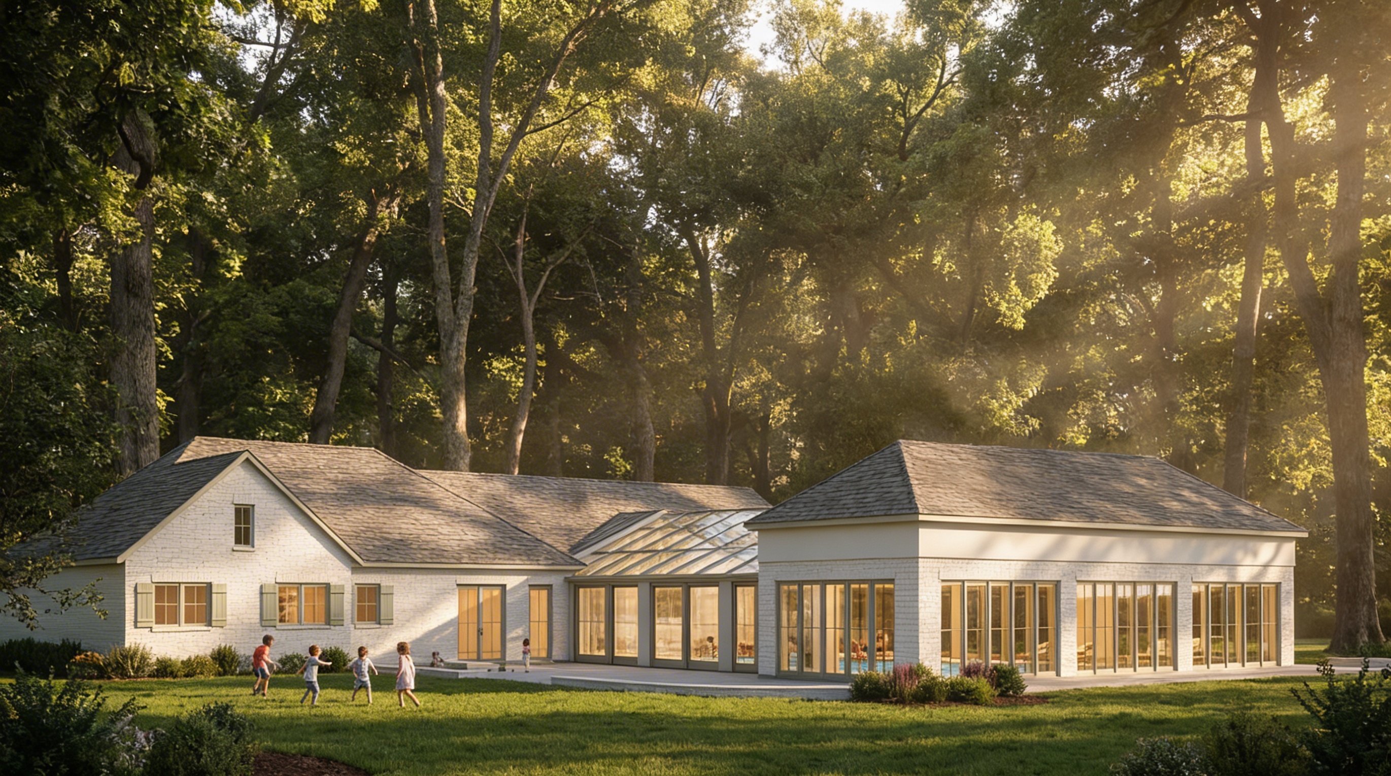 use white brick and grey grand manor roof with metal over front porch and white columns
