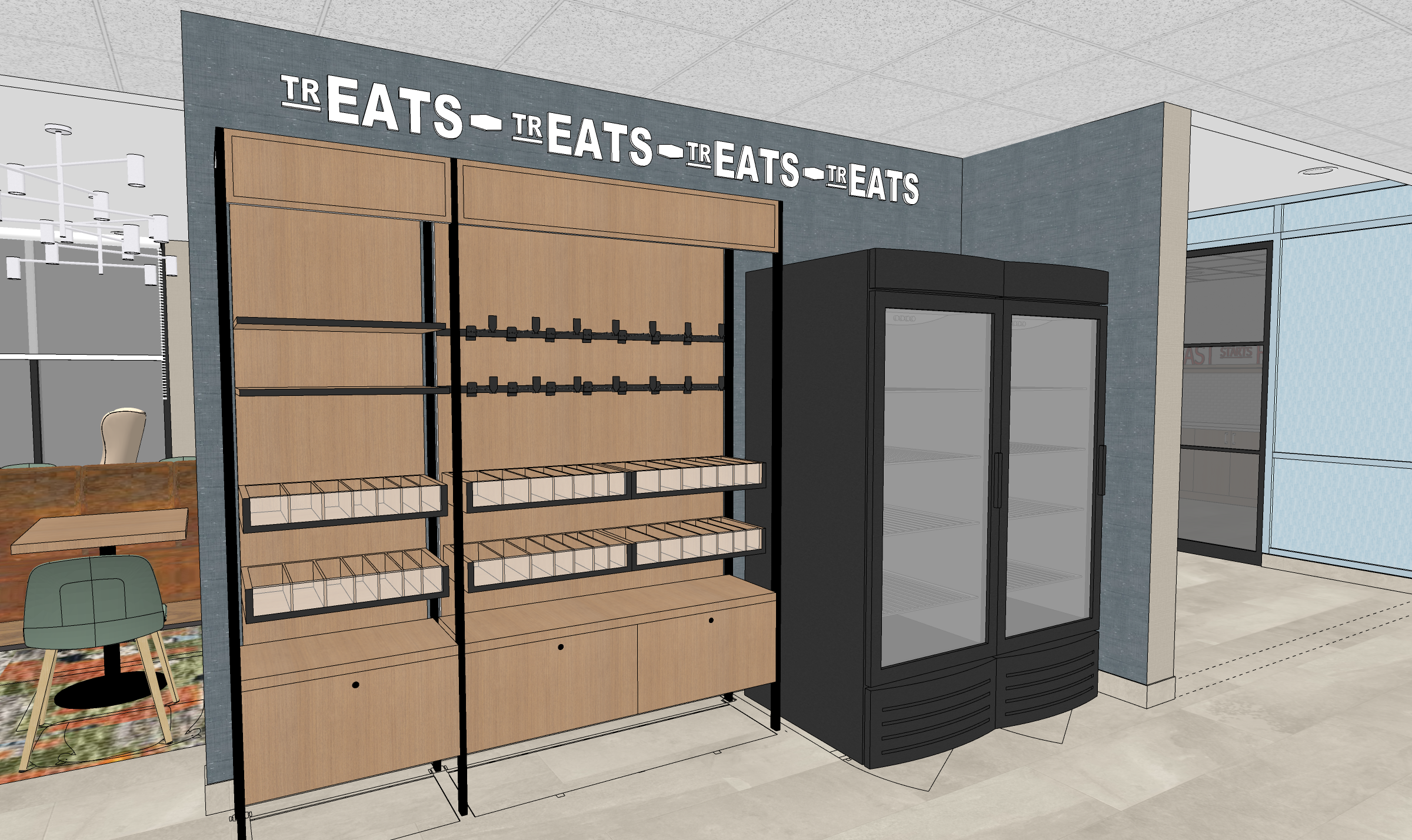 create a photorealistic interior rendering maintain all colors textures materials forms and building elements add recessed lighting in the ceiling add snacks to the market millwork and beverages in the coolers