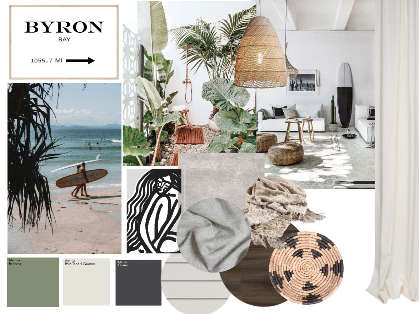 a modern boho coastal style living room in a surfer californian style with natural textures plants sunshine and coastal luxe aesthetic