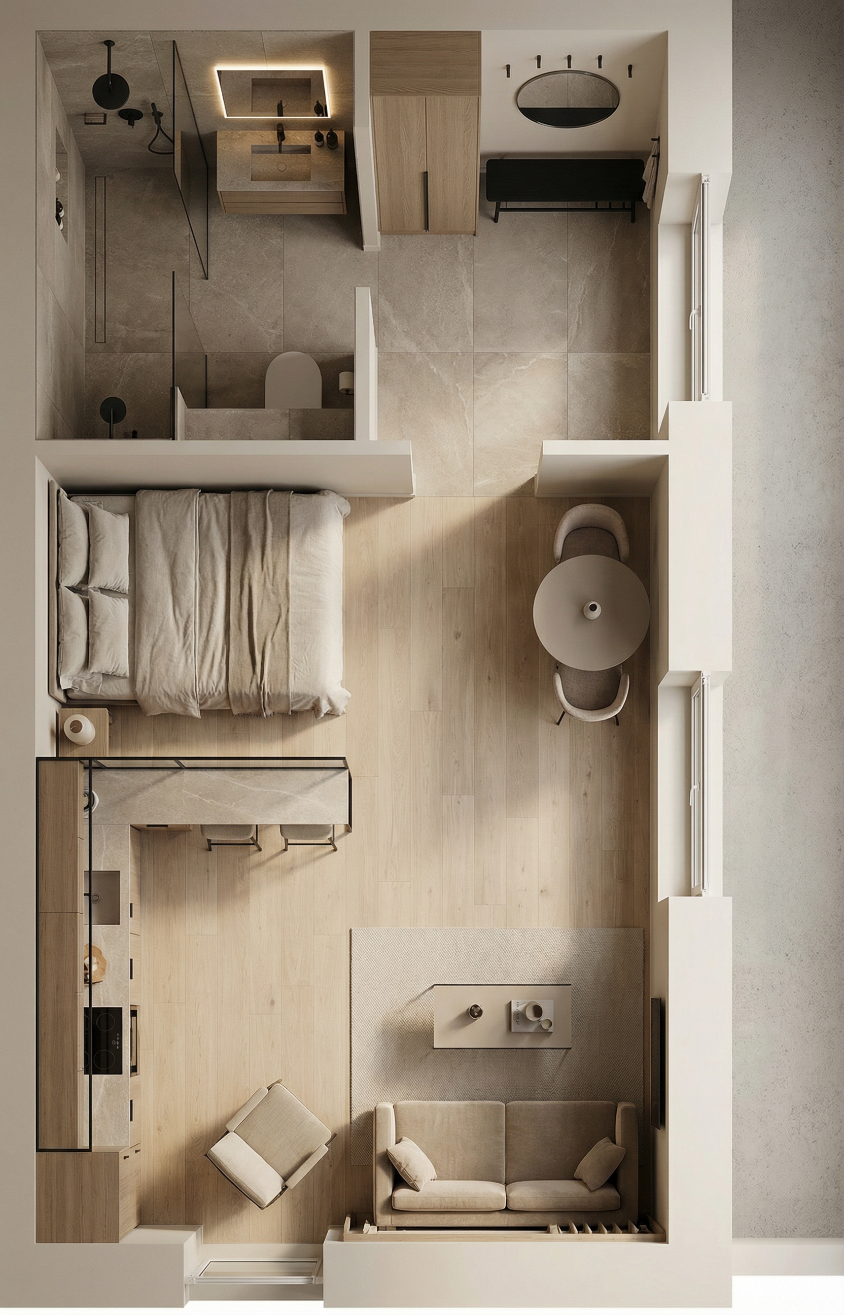 nordic interior shot cozy bedroom with double bed colorful patterned bedding wardrobe with dark handles wooden floor warm cozy lighting architecture