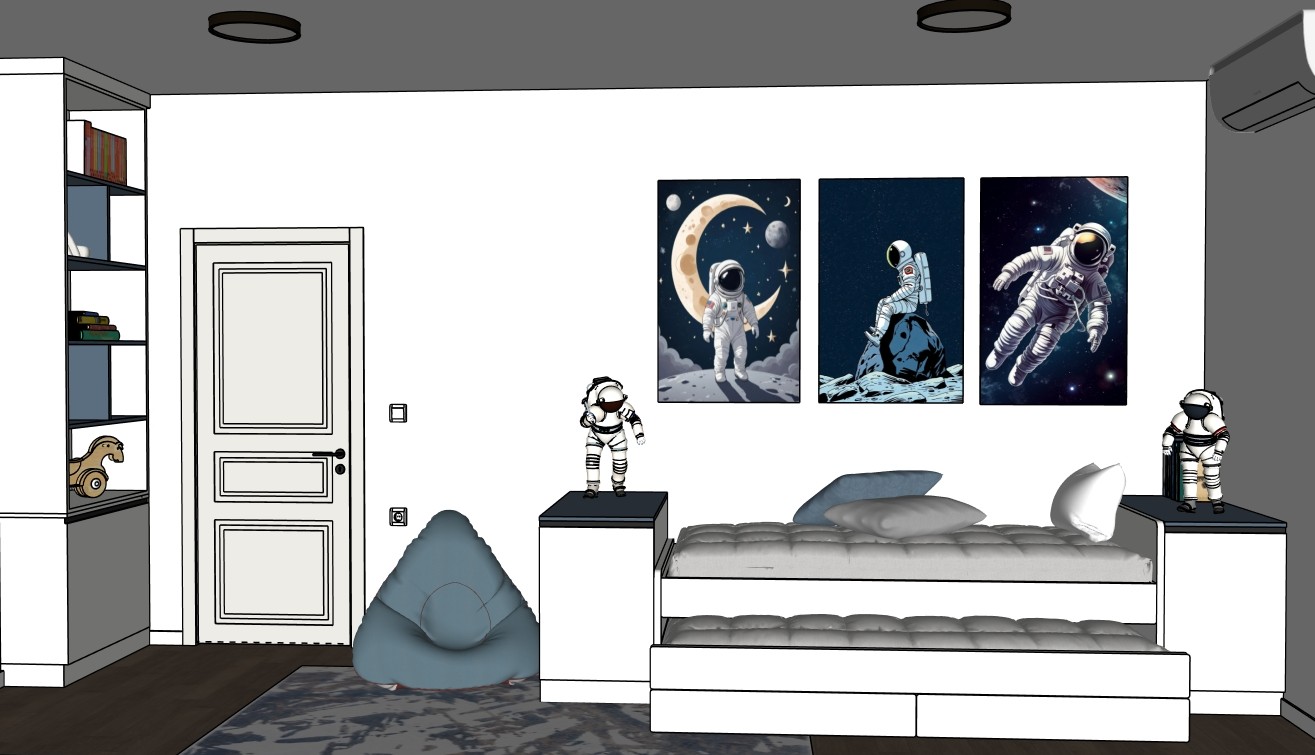 keep colors textures shapes don t change anything make photo realistic with natural light light come from right side window is not visible on render shelf dividers and the end panel of the bedside cabinet are dark blue