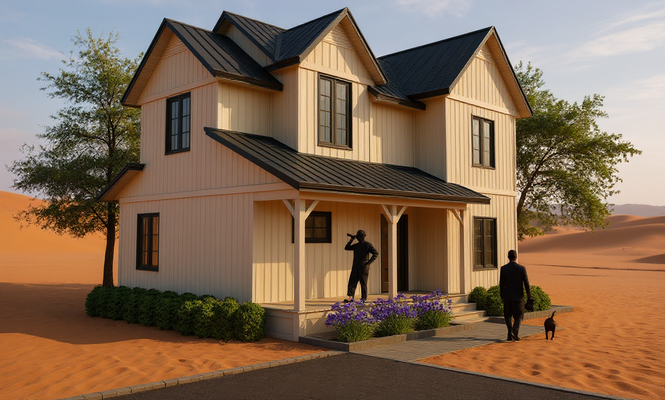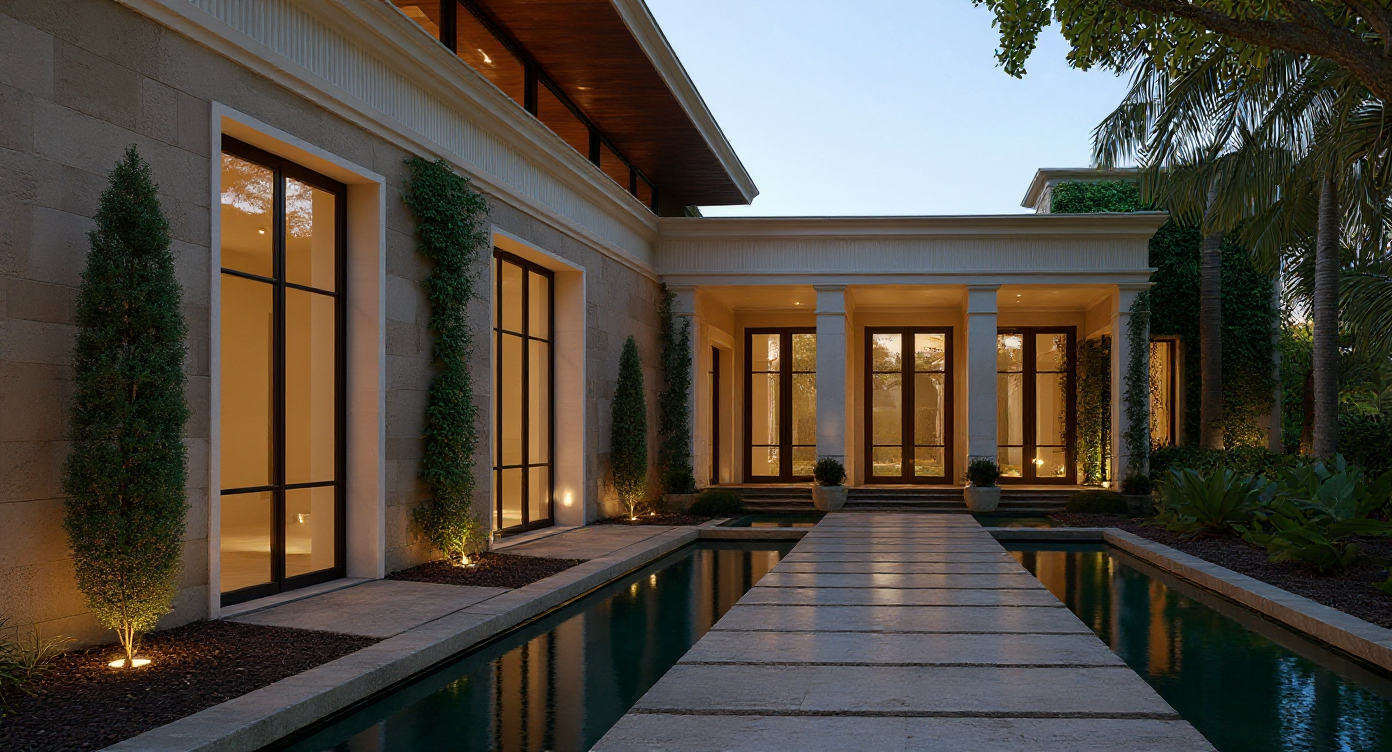 emphasis the classical elements on this modern house make the stone cladding smooth and consistent in colour add more landscaping add lighting to the interior of the house add more topiary style lush tropical style planting to the left and right hand side also included some climbing planting on the walls reduce the freeze below the cornice