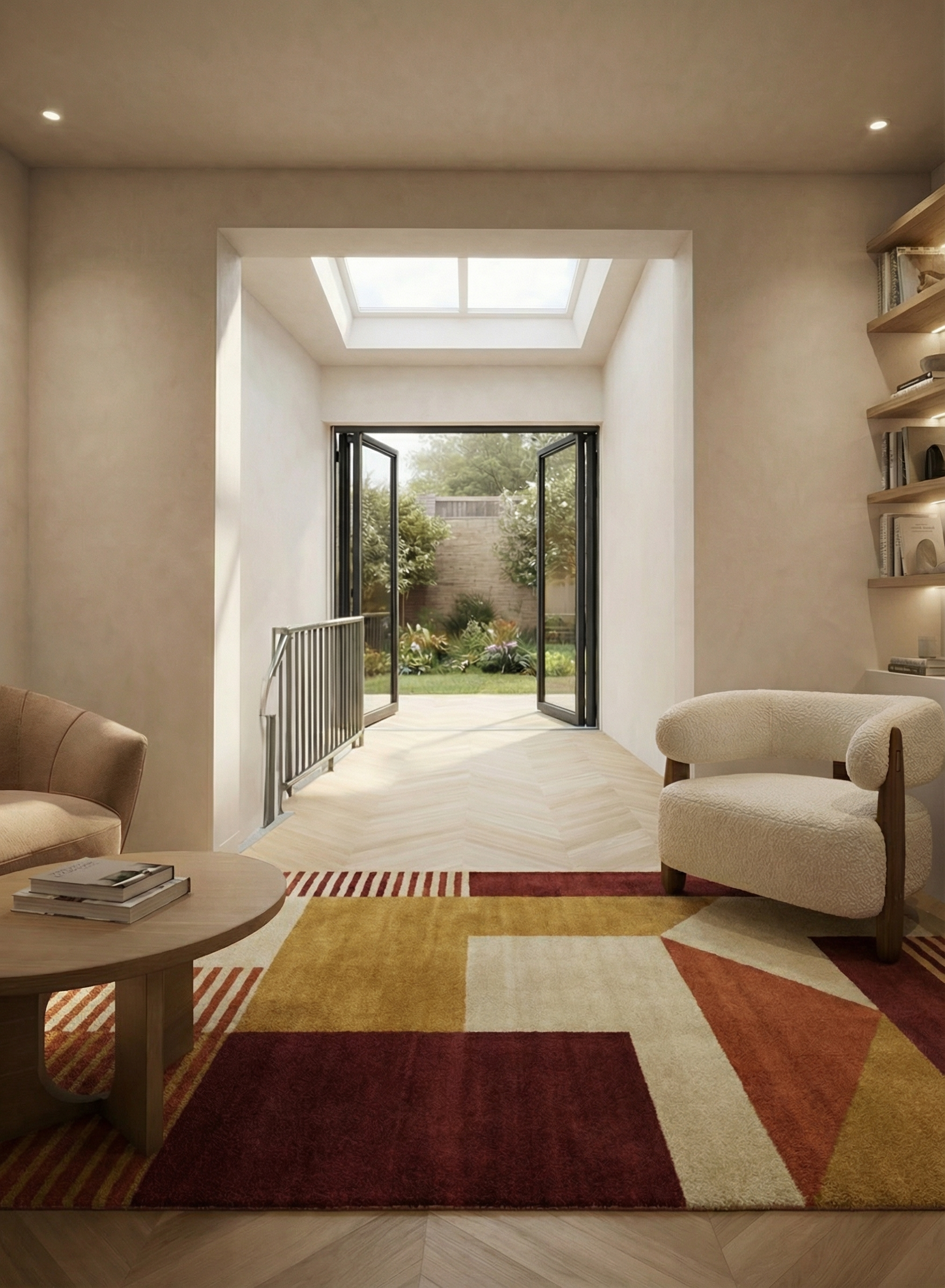 add a large plush rug in cream beige and brown