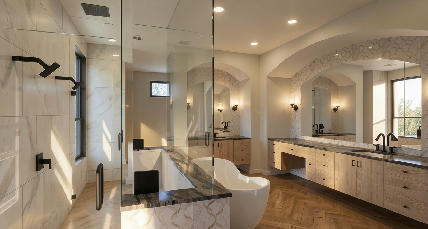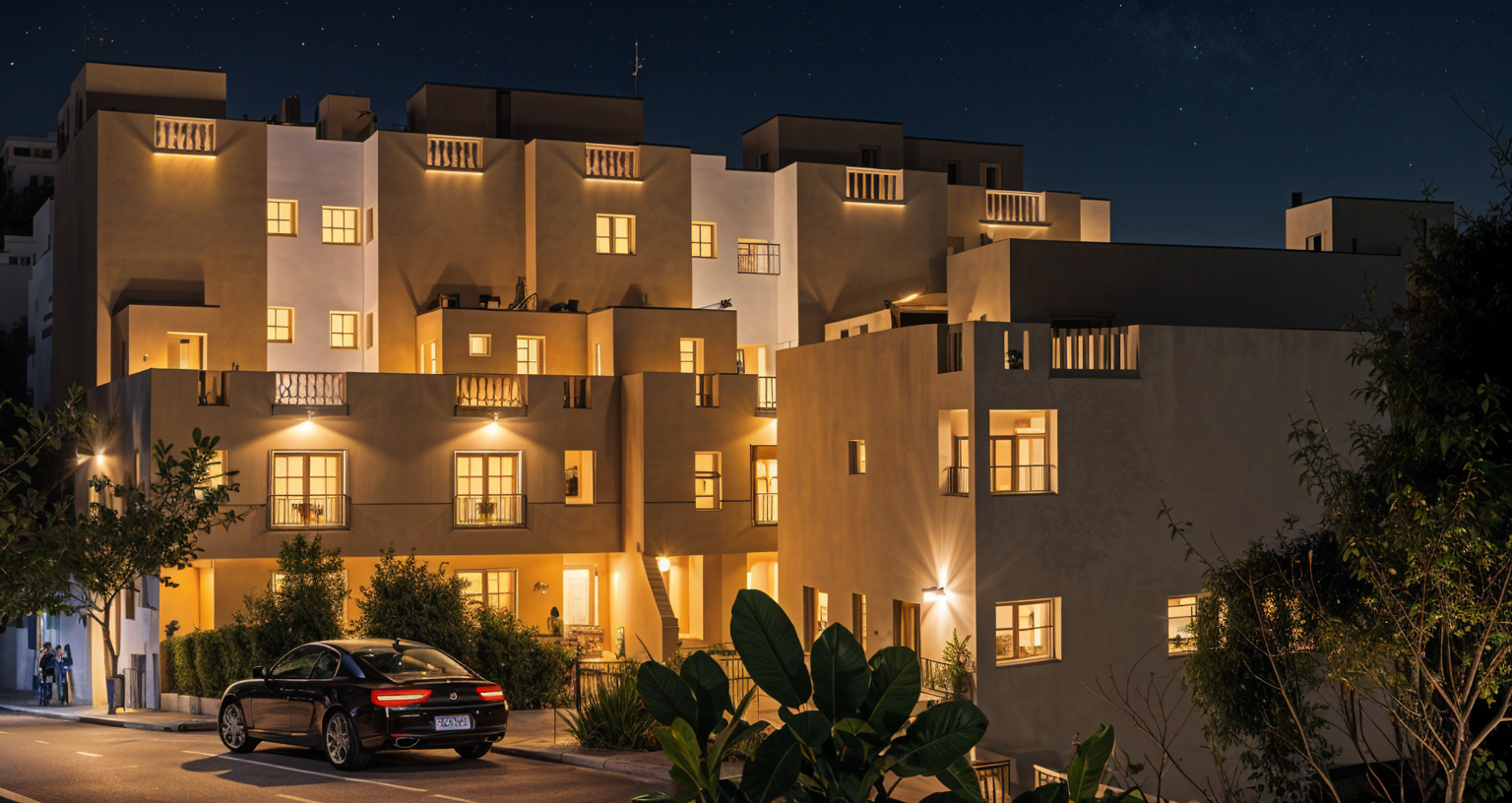 photorealistc architectural render realistic materials do not change colors or tone turn on light fixtures do not add windows on the wall in the background