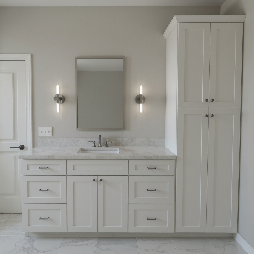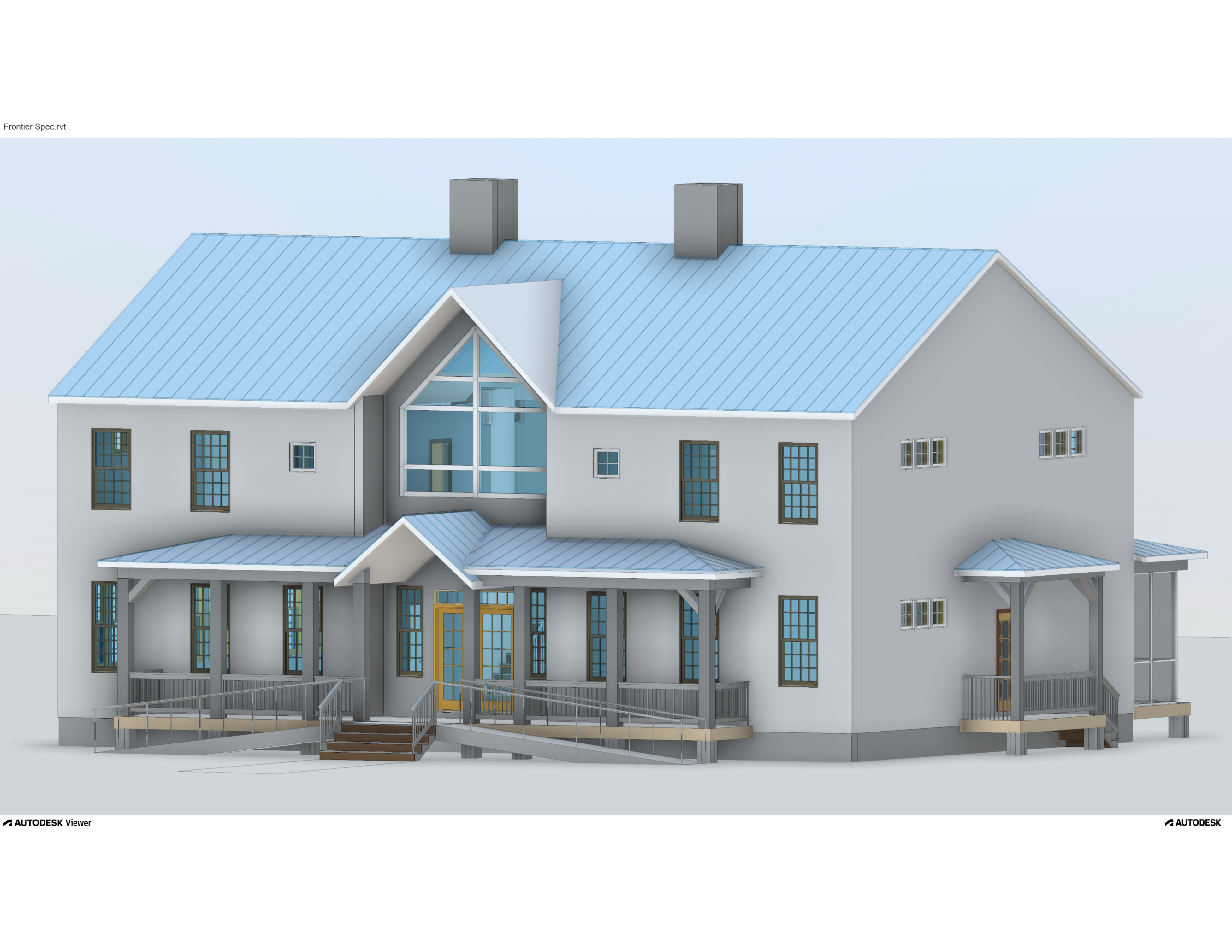 render a charming modern farmhouse with grey walls and a light red metal roof use earthy tones for the doors and window frames such as deep brown or forest green the veranda and railings should be in a warm neutral beige the entrance features should be accentuated with welcoming wooden steps place this house in a serene pastoral setting capturing the soft natural light of a late afternoon the atmosphere is peaceful and inviting with a clear blue sky providing the perfect backdrop