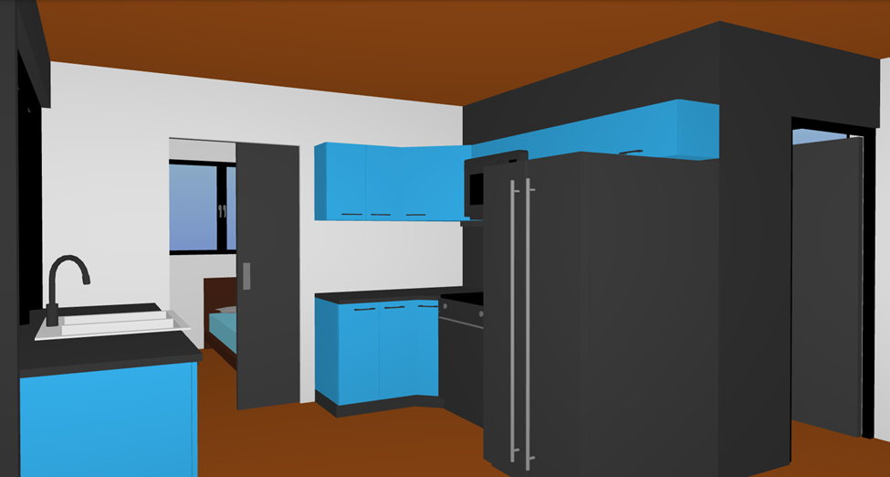 this is the kitchen in a small modern home shot from the living room towards the kitchen area all hardware should be black and appliances in a dark stainless steel behind the kitchen area is a pocket door that leads to a bedroom the ceiling and floor should be in a walnut plank with the walnut planks going front to back golden hour lighting