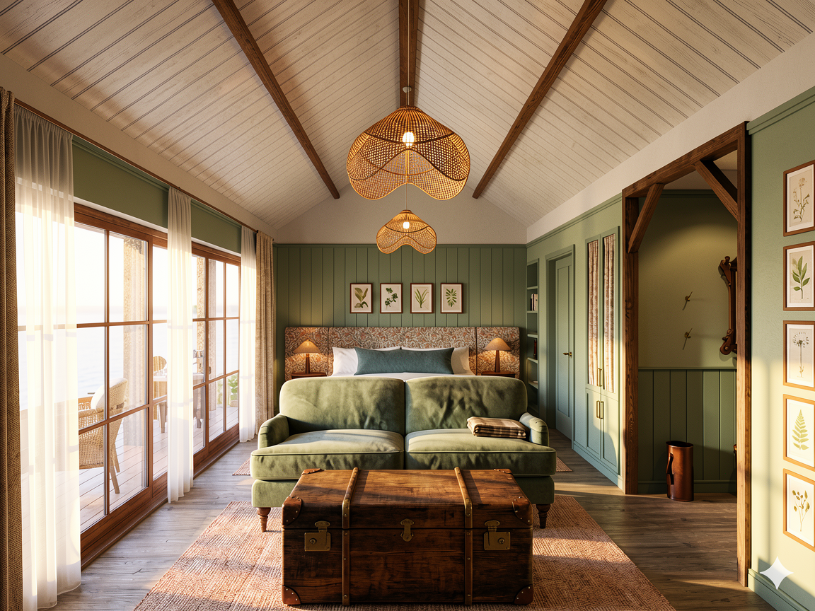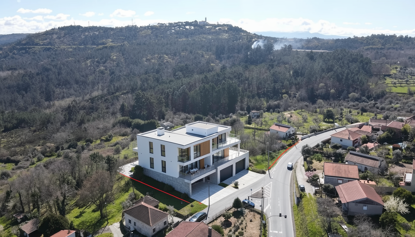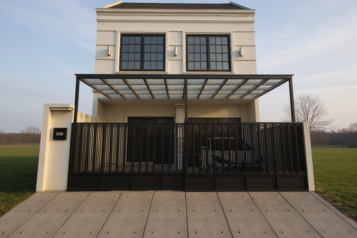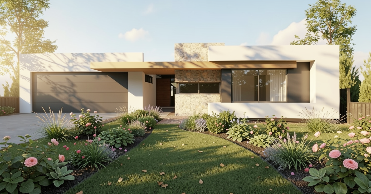photorealistic architectural visualization of a modern single story bungalow with an integrated garage the bungalow is located on a clearly defined plot of land along the entire property boundary a fence is visible clearly marking the lot line the fence matches the reference image exactly in terms of material color and style and blends harmoniously into the overall design all colors materials and finishes of the house including fa ade roof garage door and architectural details are taken directly from the provided reference image and must be reproduced accurately realistic materials such as plaster wood metal and glass natural lighting conditions soft realistic shadows and accurate reflections well maintained landscaping with grass subtle plants and a paved driveway leading to the garage eye level perspective with a slight wide angle view clean architectural lines modern design high level of detail ultra realistic 8k resolution architectural visualization archviz global illumination depth of field realistic textures natural color balance professional real estate rendering