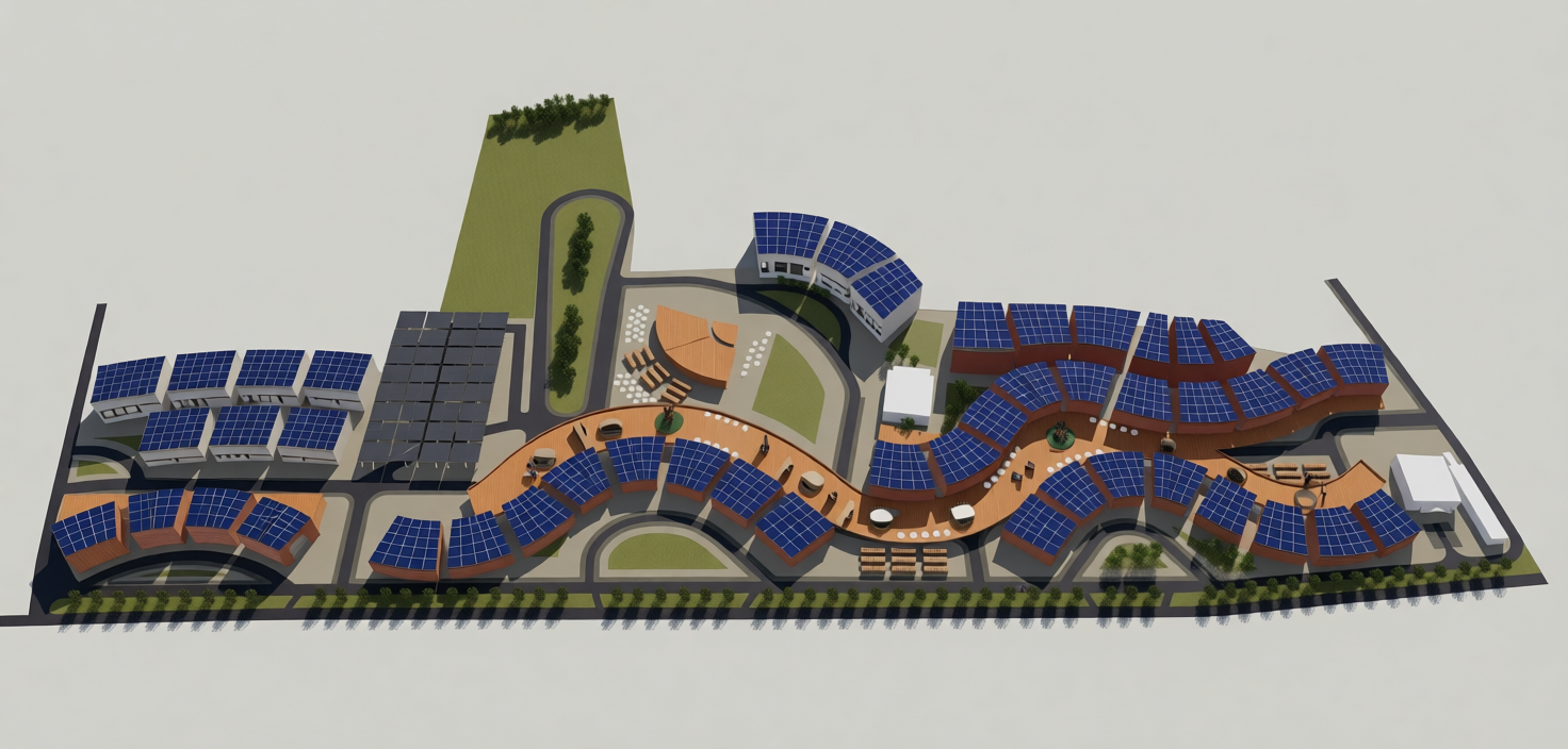 neutral architectural render strict model fidelity neutral architectural aerial render generated strictly and only from the provided sketchup 3d city model this is a literal viewport style rendering not a photorealistic reinterpretation accuracy and fidelity take priority over realism geometry absolute hard lock maintain the exact geometry as modeled in sketchup no creative freedom of any kind do not straighten curves simplify geometry smooth edges or alter topology all curves arcs bends and irregular geometries must remain exactly as modeled materials colors absolute hard lock use the original sketchup materials exactly as assigned preserve original base colors exactly do not change hue saturation brightness contrast gamma or warmth do not enhance beautify enrich or stylize materials no pbr reinterpretation no realism filters no color grading the output must look like a high quality sketchup viewport capture not a rendered redesign wood strictly neutral non realistic the elevated pedestrian boulevard uses the existing sketchup wood material treat the wood as a flat architectural surface not as realistic timber do not add realism warmth grain enhancement texture depth or contrast do not introduce orange amber golden or warm tones wood must remain neutral desaturated and color faithful to the sketchup material plank direction limited exception texture orientation only rotate the texture direction to diagonal this is a uv rotation only do not regenerate redraw or improve plank texture quality accept slight abstraction rather than realism if diagonal planks require regenerating the wood texture do not do it preserve material fidelity instead surface meaning preserve asphalt vehicular roads only wooden deck pedestrian only surface no reinterpretation no added markings no objects solar panels color lock solar panels must remain dark neutral gray no blue tint no cyan no glass appearance no reflections matte to low gloss only allowed change panel grid subdivision only lighting shadows match sketchup lighting and shadows must match the original sketchup image exactly do not strengthen dramatize or soften shadows no global illumination no ambient occlusion no hdr lighting must behave like a neutral sketchup viewport camera locked retain exact original camera position angle lens and framing no pan tilt zoom or crop population none no people vehicles furniture trees props or objects validation rule if any of the following occur the result is invalid wood turns orange or warm wood texture is regenerated planks look stylized or artificial materials change shadows intensify geometry alters accuracy realism at all times negative prompt important realistic wood warm wood orange timber rich grain stylized texture material enhancement color grading hdr dramatic lighting people vehicles
