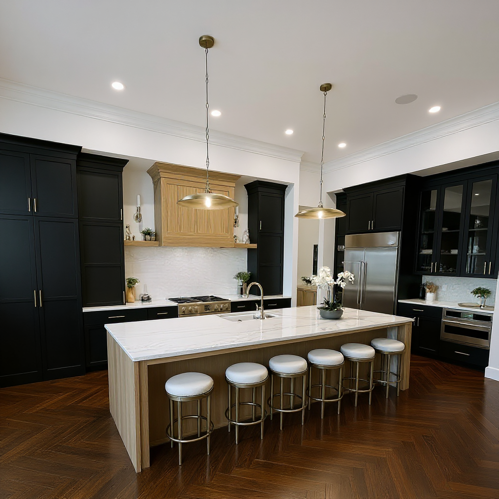 black roof black window frames light grey weatherboards lawns extensive native planting background trees sunset