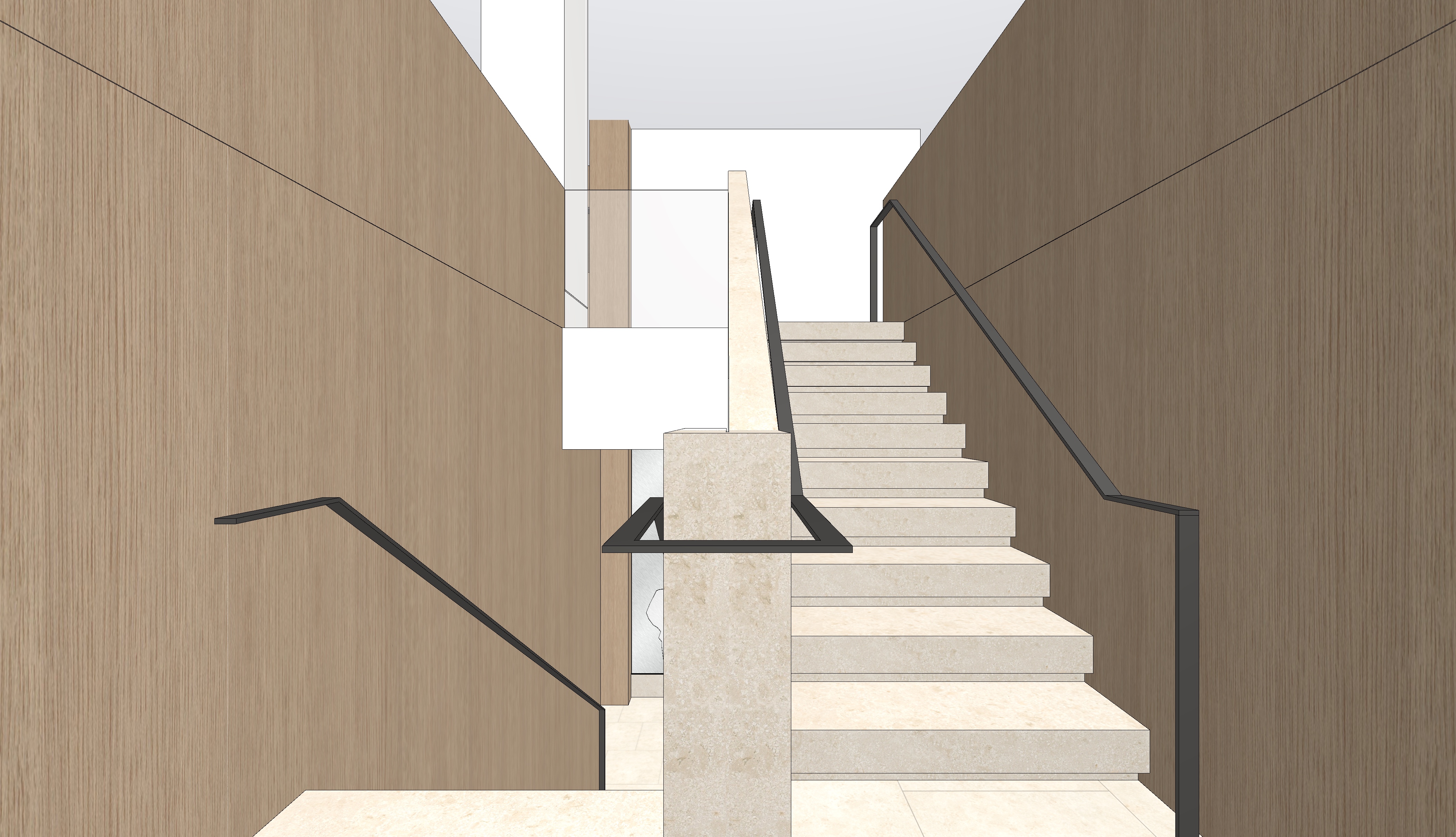 rift oak and limestone stair with dim lights under each tread glass railing at top