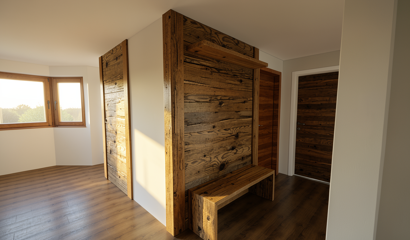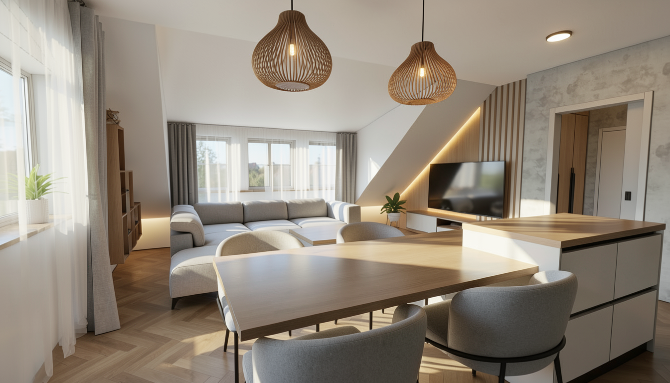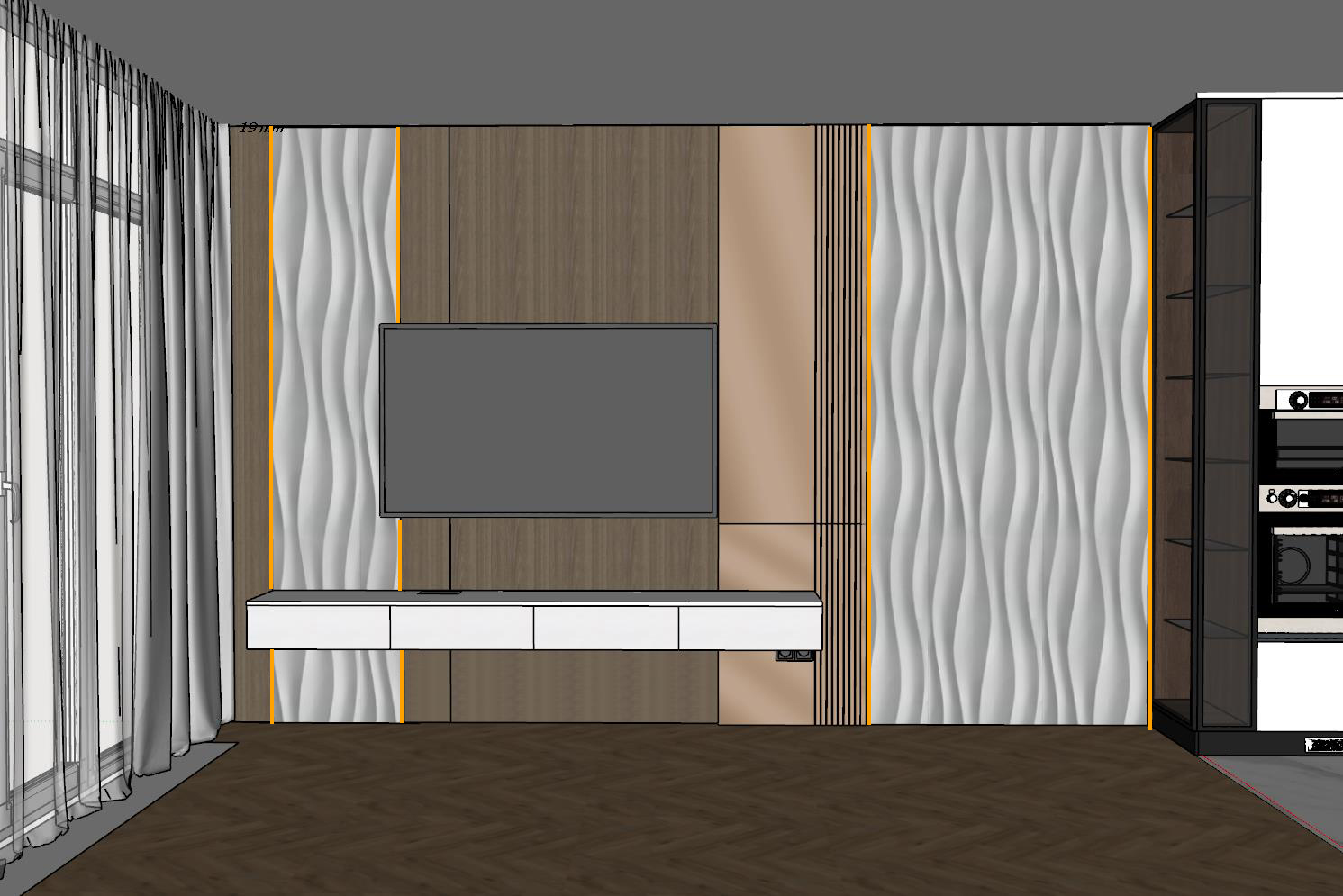 technical realism correction of the provided interior wall image preserve all geometry layout and proportions treat the image as fixed furniture construction two layer wall only front layer wood panels champagne mdf panel and vertical slats on one flat plane back layer white textured gypsum 3d panels recessed behind the yellow orange vertical guide stripes indicate hidden led strip positions convert these stripes into narrow recessed warm led lighting joints do not remove them transform them into realistic hidden light gaps led strips must be thin and precise fully integrated inside the front panel joints soft warm wash light only light shining backward onto the gypsum 3d texture do not add lighting anywhere else no lighting under the tv no lighting inside the champagne flat panel area no lighting in the smooth panel zone behind the tv no extra vertical light lines protect the champagne mdf panel do not modify its color texture or surface keep the slatted section and the smooth champagne section unchanged this is a furniture lighting detail not decorative wall lighting natural daylight from the window balanced exposure photorealistic material behavior remove guide stripes extra light strips light under tv wide glowing gaps light columns neon effect panel redesign material change champagne panel modification new lighting zones
