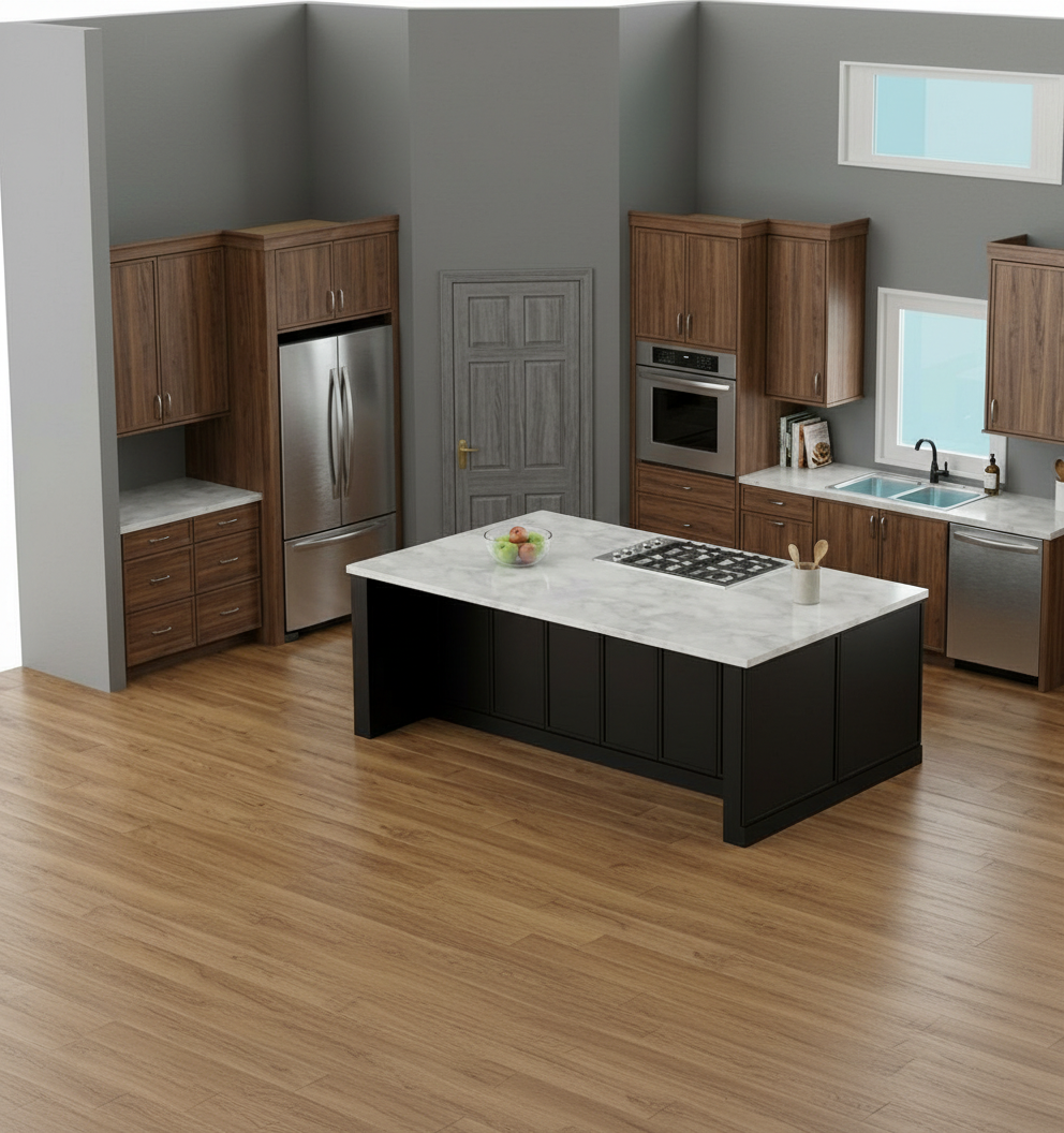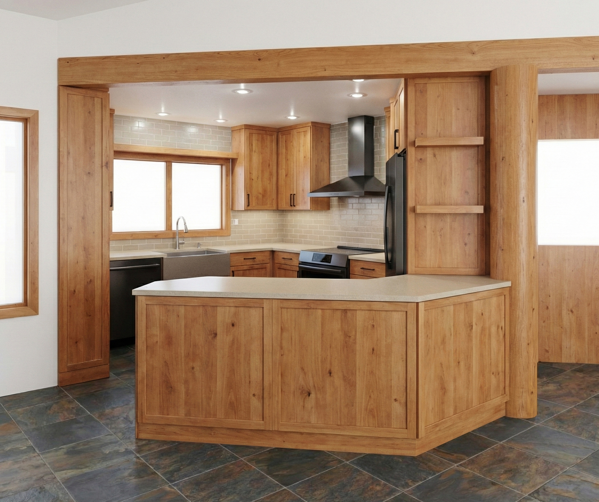 exterior shot slate tile flooring natural stain wood cream tan countertops and backsplash tile black stainless steel appliances