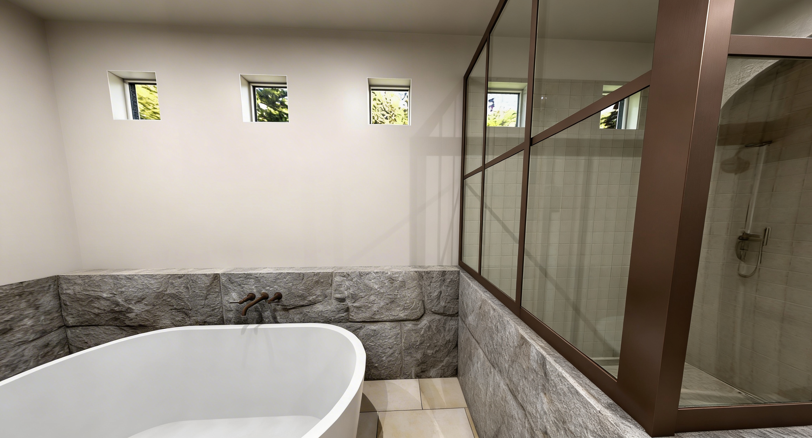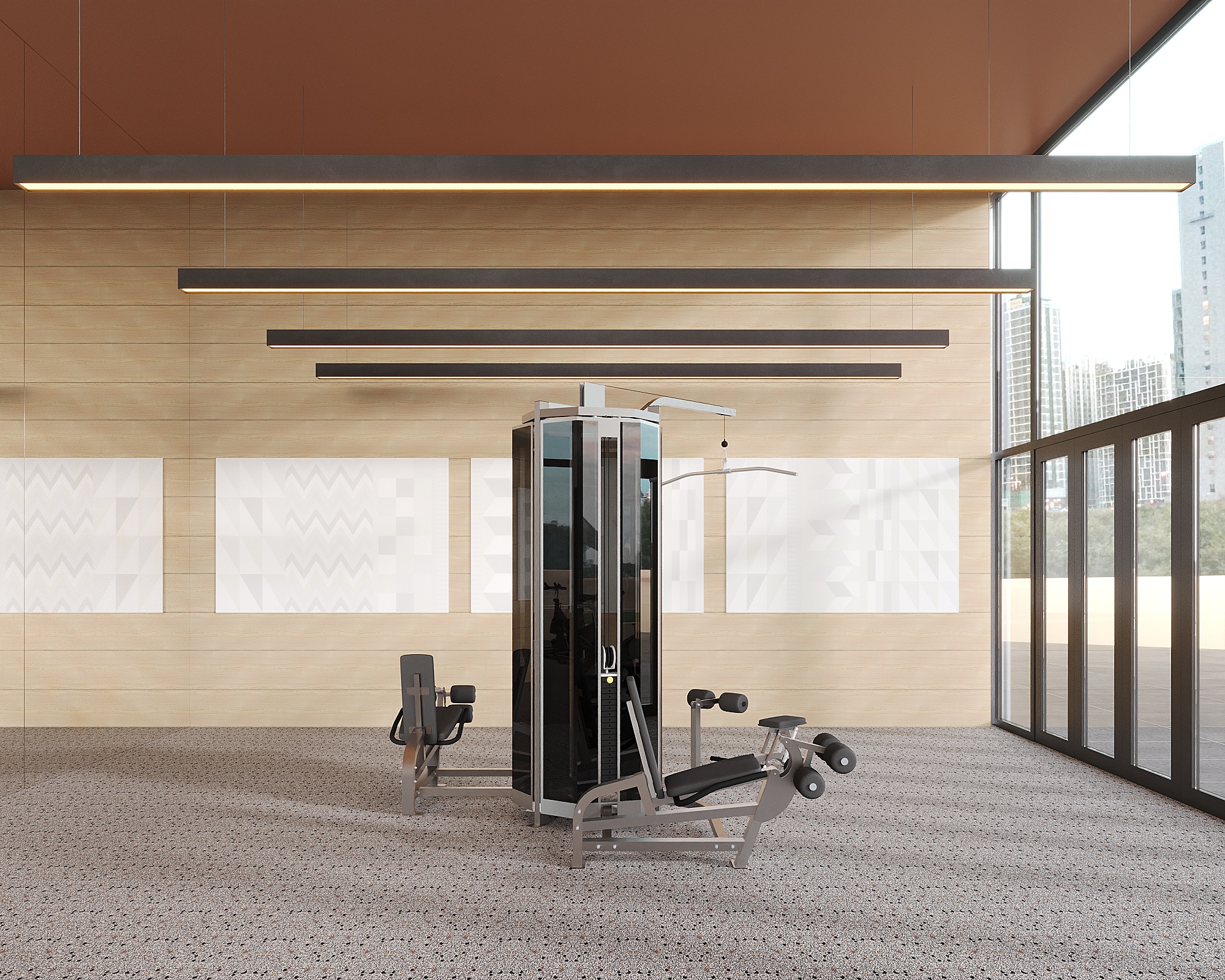 replace the wood wall in the back of this image with a forest scene this forest should should look like a forest from vancouver bc the windows on the right to remain the same add roller shades on the windows which come down 24 from the ceiling