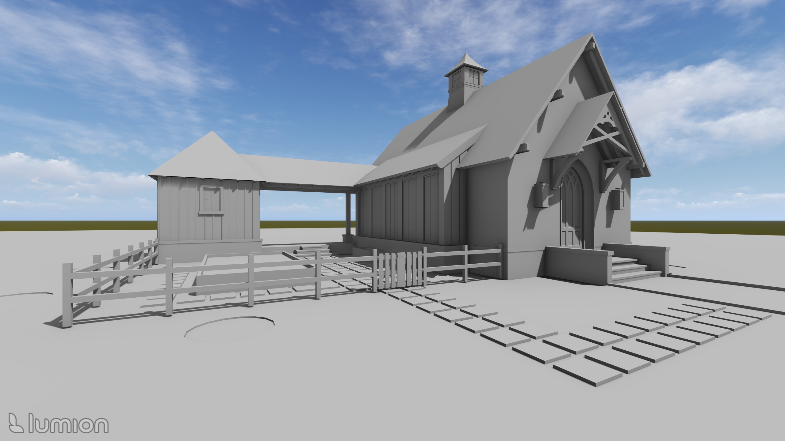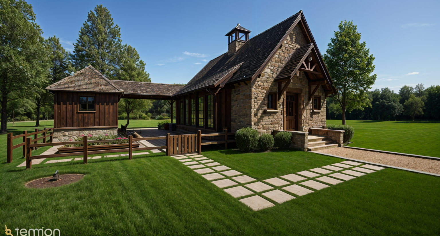 exterior shot rustic chapel in the forest stone siding stained wooden accents cedar shake roof stone pavers grass yard wooden flower boxes with a fresh garden tinted glass windows trees in background