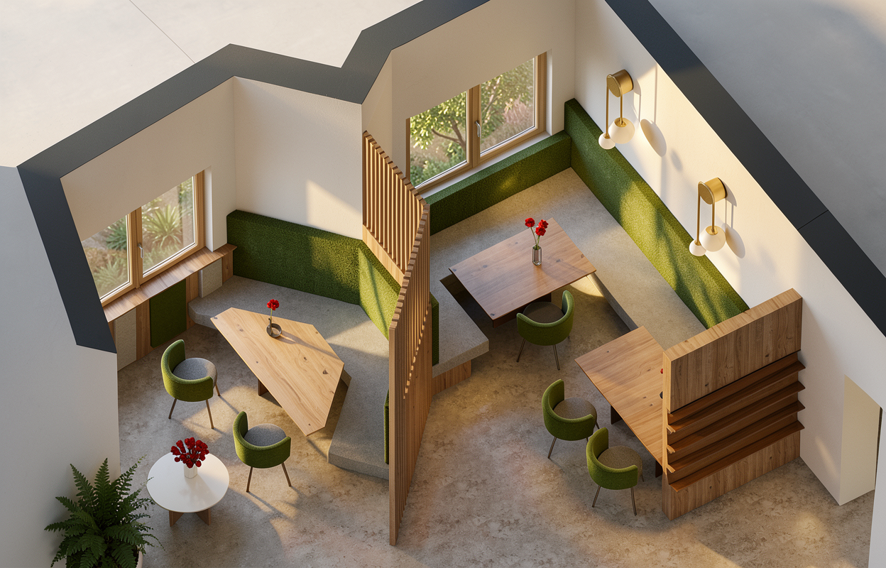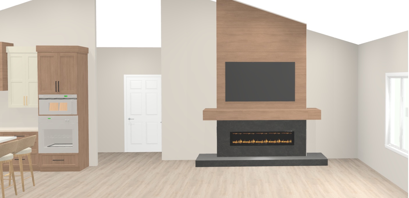 modern fireplace with black hearth and warm light wood upper and warm light wood flooring