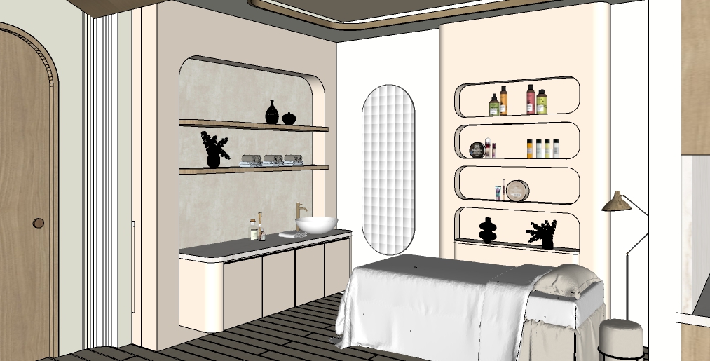 create ultra realistic images without changing any structure shape design or materials do not resize jpegs beige wood vinyl flooring plain off white walls off white ceiling white bed add indirect light and in wall is mirror white marble to table