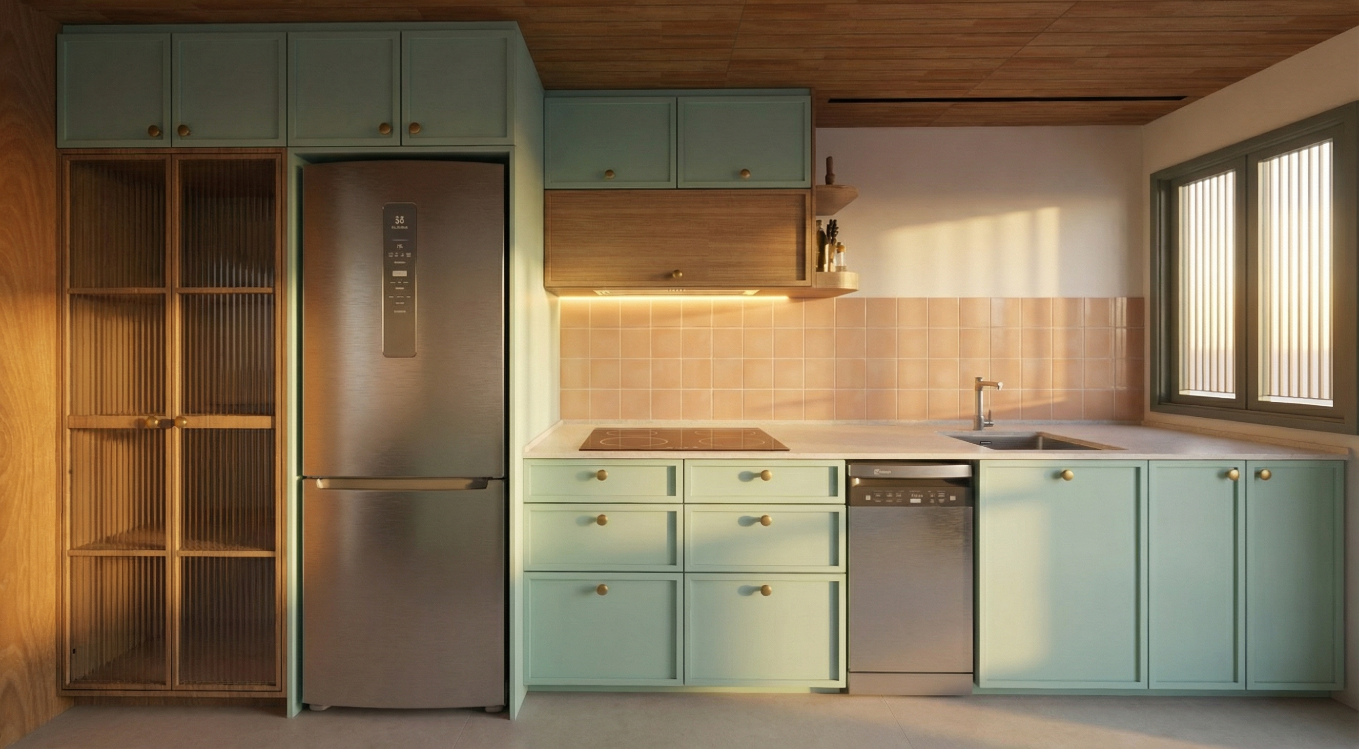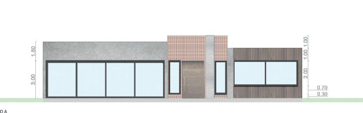 this is the front facade of a house the facade is composed of three parts on the left large format sliding doors of glass and black aluminum with a rustic concrete finish located in the foreground in the center is the main pivoting door of walnut wood with two black metal framed glass windows the wall finish is square clay lattices and it is located in the background on the right is the third part which is in the background with glass windows and black aluminum frames and the wall finish is wooden slats mantenin de dimension