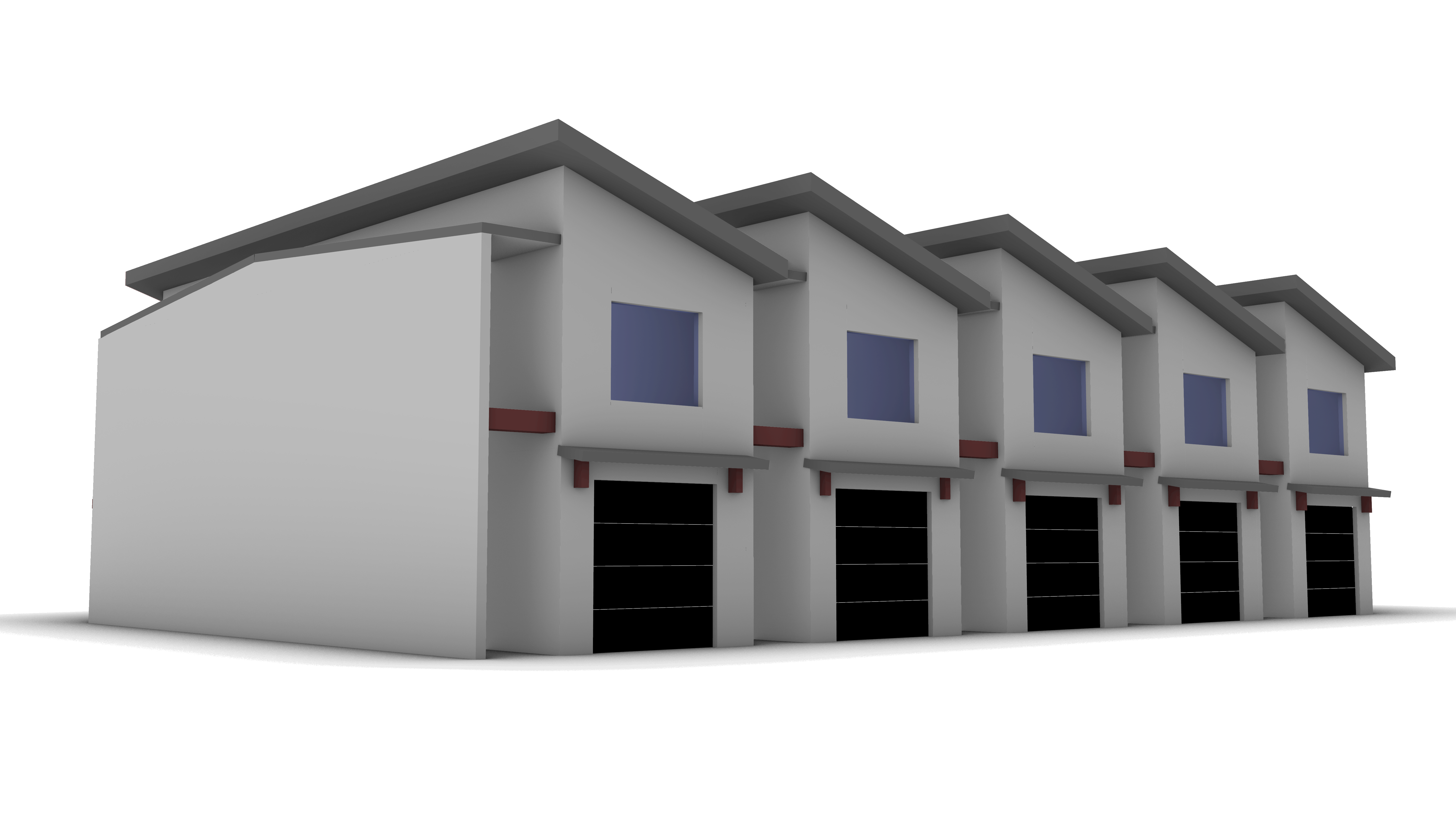 render this townhome building in a west coast modern style keeping all existing geometry and proportions exactly as shown use a rich yet balanced material palette featuring dark metal panels smooth fiber cement or stucco in warm grey tones and moderate accents of natural wood such as vertical cedar cladding or soffit details to introduce warmth each vertical roof segment should read as a distinct unit by subtly varying the material combinations alternate between darker metal lighter grey panels and wood tones for contrast and rhythm the large doors on the lower level are garage doors and should appear as modern dark aluminum or composite panel styles not wood include black framed windows clean detailing and restrained trim lighting should be soft and natural to highlight textures and shadow lines the surrounding landscape should be minimalist and modern with low plantings and concrete or paver walkways consistent with west coast modern design