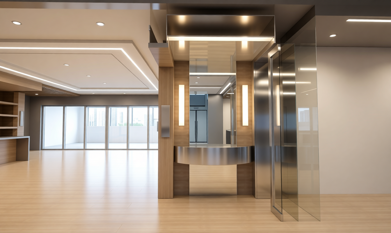 a modern two story office building featuring a long facade dominated by large reflective glass windows and dark aluminum mullions the prominent half circular columns to be painted dark gray flat roof parapet with dark gray paint higher entry surround with wood clad and soft led lighting visible around the main entry only add a signage of seegers at the top center of building entry with led light at its back of the signage remove free standing seegers signage at pavement keep entry surround with light wood finish clad make the pavement at entry narrower change color of the stamp concrete to beige matches the wood clad of entry surround remove seating set up add bench on both sides of entry add two ornamental trees one on each side of the entry add a long modern light fixture on both side of the entry only replace the swing entry doors with a revolving entry remove canopy by entry add flanked by colorful flowers the structure is set against a vibrant blue sky and surrounded by lush green grass and autumnal trees displaying vivid red and orange foliage the atmosphere is clear and sunny with bright light illuminating the scene and casting soft shadows across add every expansive black asphalt parking area where a few cars are parked and pedestrians are walking