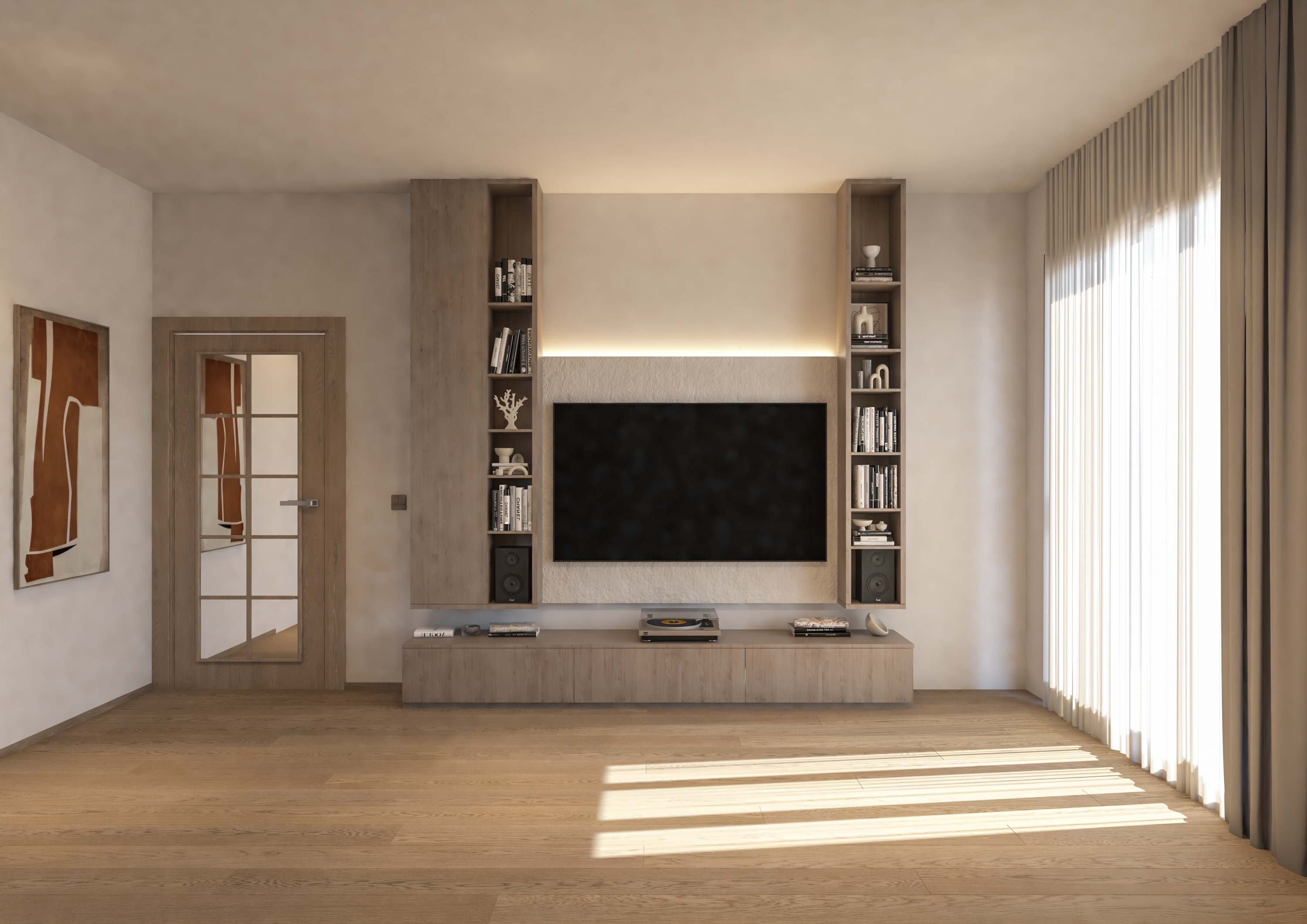 edit the image while keeping the entire scene identical change only the lower floor cabinet beneath the tv the long cabinet sitting on the floor to white mdf white matte lacquered furniture board bijeli medijapan material should be smooth matte white furniture panel with subtle realistic reflections and clean edges keep the same cabinet design proportions handles and placement only change the color and material to matte white mdf everything else must remain exactly the same wooden shelves tv wall books decorations walls door curtains lighting shadows floor and overall composition maintain photorealistic architectural render quality natural lighting realistic materials sharp details global illumination