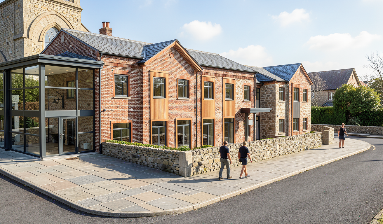 make as photorealistic as possible keep textures the same as shown add professional landscaping in a lightly wooded suburban scene in columbia sc match materials as shown with the following brick evelyn grey stucco ddd8d6 trim e8e4d4 soffit and fascia white windows black roof georgetown grey certainteed dimensional shingles railing white door and side lites 753c4b shutters 54363e