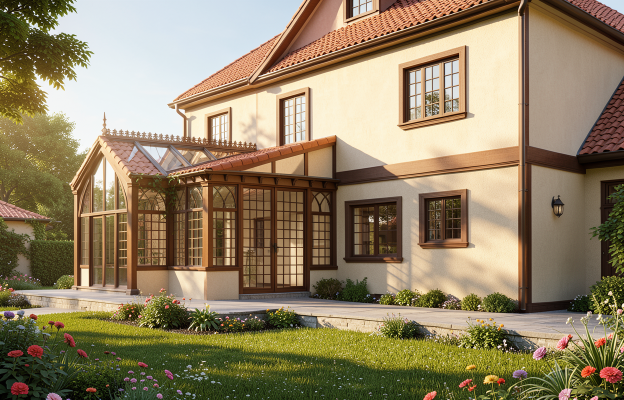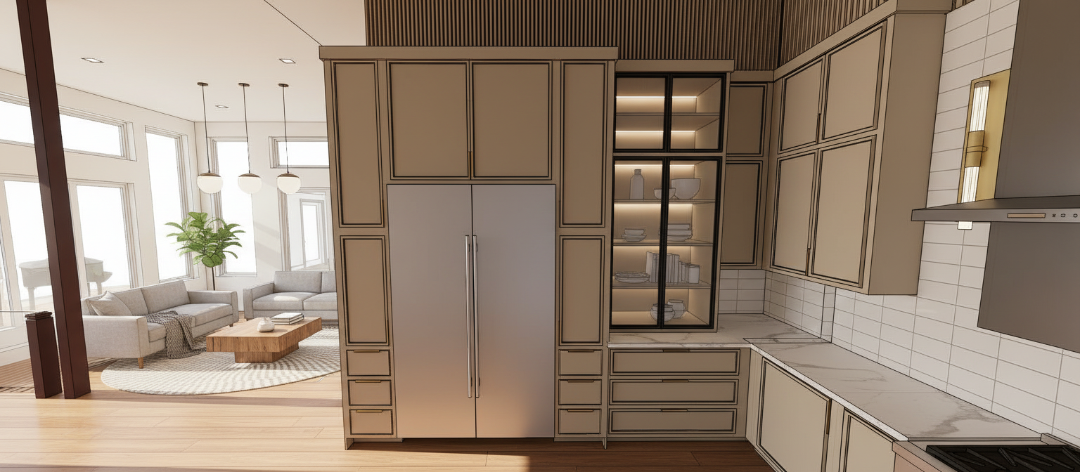 render a modern kitchen featuring rich walnut cabinets with a smooth matte finish highlight the elegant white marble countertops with subtle gray veining adding a touch of luxury integrate a sleek stainless steel refrigerator providing a contemporary contrast the hood is in a deep warm gray use soft ambient lighting from recessed fixtures to create a warm welcoming atmosphere accent the scene with neutral toned walls and a lightly textured warm stone floor enhancing the inviting ambiance