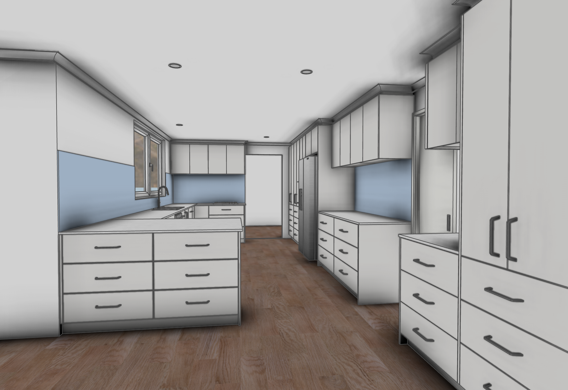 glass splashback in a light blue colour kitchen sink and tap under the main window all extra benchspace to be left free