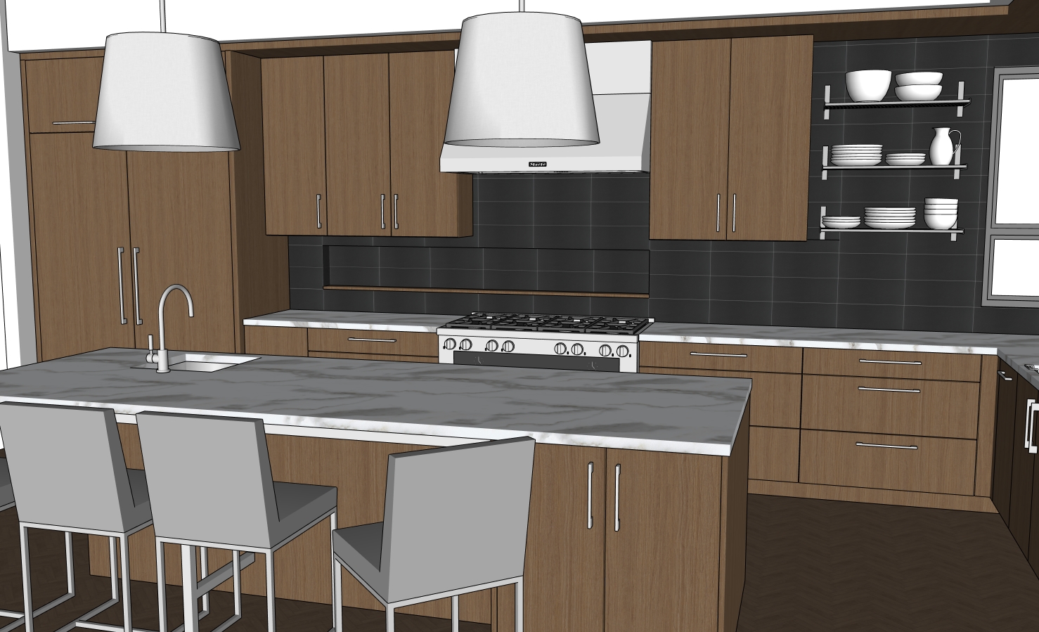 modern luxury kitchen interior warm contemporary design featuring flat panel black walnut cabinetry with rich natural grain minimal hardware using long linear pulls 10 brushed metal oversized waterfall island with soft gray veined marble countertop integrated seating with upholstered bar stools in neutral gray fabric back wall includes a professional gas range with custom hood surround glossy black elongated subway tile backsplash 4x16 stacked horizontal reflective finish and floating shelves with curated white ceramic dishware large window wall with divided light mullions soft natural daylight entering creating gentle contrast and reflections on polished surfaces island includes a sleek undermount sink with a high arc modern faucet in warm brushed gold finish two oversized linen drum pendant lights hang above the island softly diffusing light built in tall cabinetry wall with integrated appliances maintaining a seamless panel ready look flooring is dark stained wood matte finish adding depth and contrast to lighter surfaces style rendering direction photorealistic v ray style rendering global illumination soft shadows accurate material reflections slightly softened edges for a polished cg look balanced exposure warm neutral color grading subtle bloom on highlights realistic textures no over sharpening high dynamic range lighting camera angle at eye level 24 35mm lens feel depth and perspective emphasized clean composition focused on island and cabinetry
