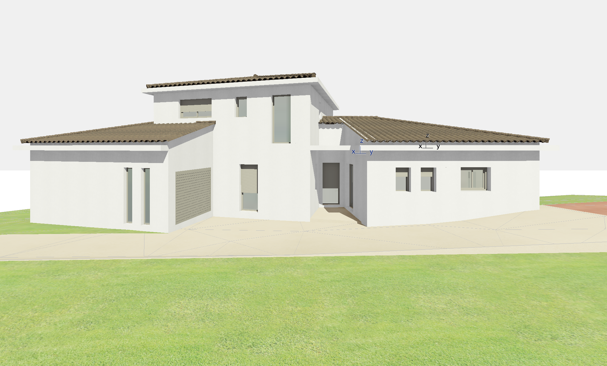 mediterranean landscape in the backgound lot of light and reflects in the windows add some mediterranean pine trees and olive trees more sun on the facade